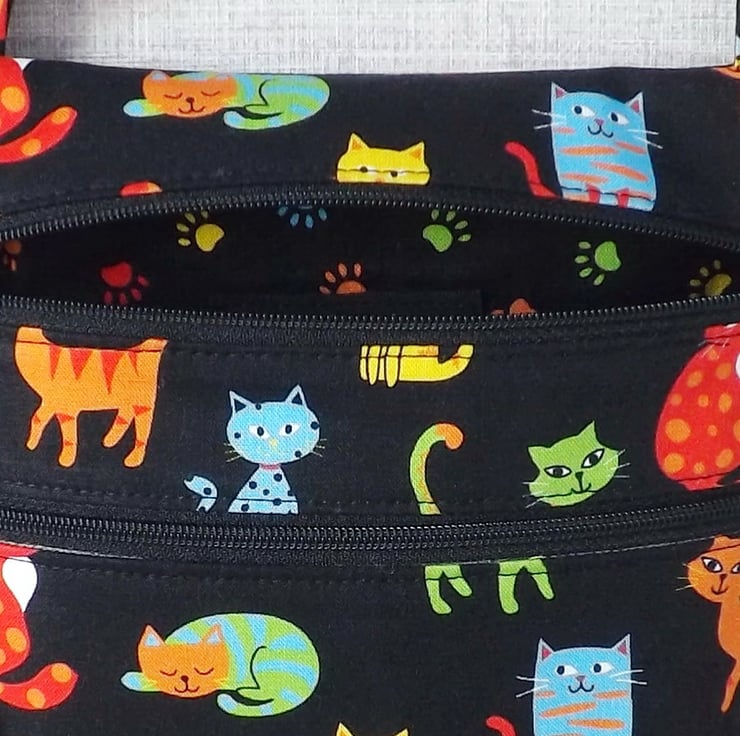 A practical cross body bag made from 100% cotton fabric. The main fabric has a cute design of cats in shades of blue, red, green, yellow & orange on a black background. The lining is a co-ordinating fabric from the same range, with paw prints in the same colours as the main fabric.