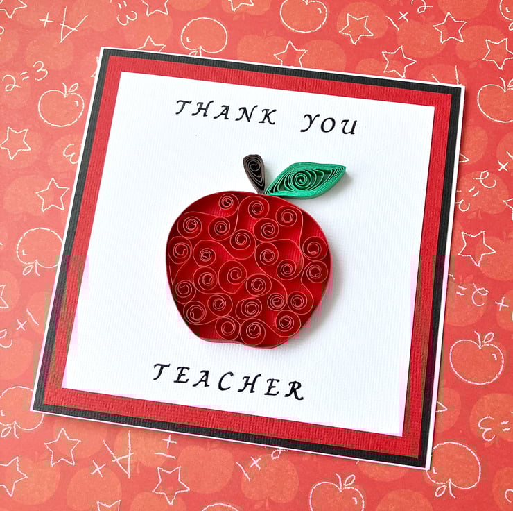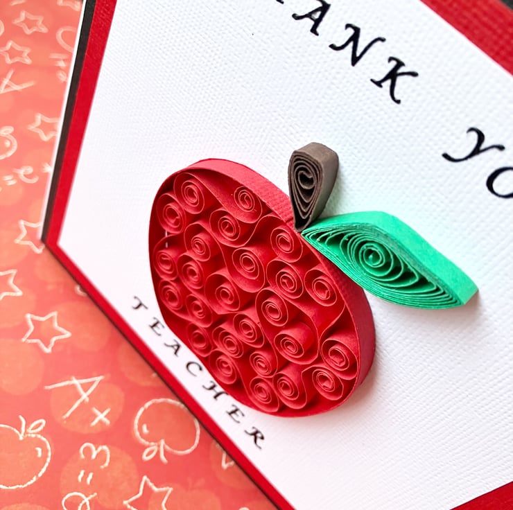 The card features an apple decorated with handmade quilled S scrolls. A quilled stalk and leaf finish off the card perfectly and the greeting reads Thank You Teacher in black letters.