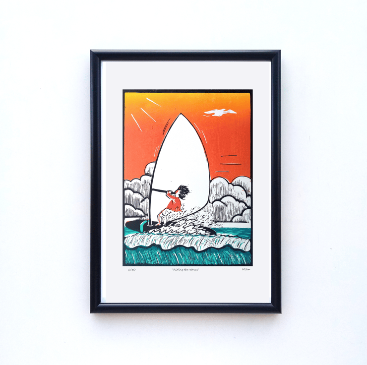 Handprinted ECO Linocut Windsurfer Waves Print Water Sports