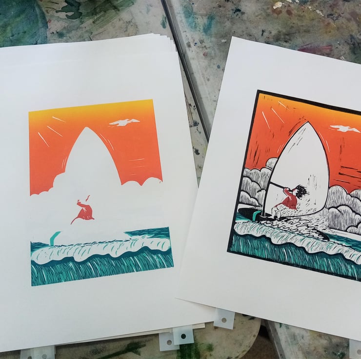 Handprinted ECO Linocut Windsurfer Waves Print Water Sports