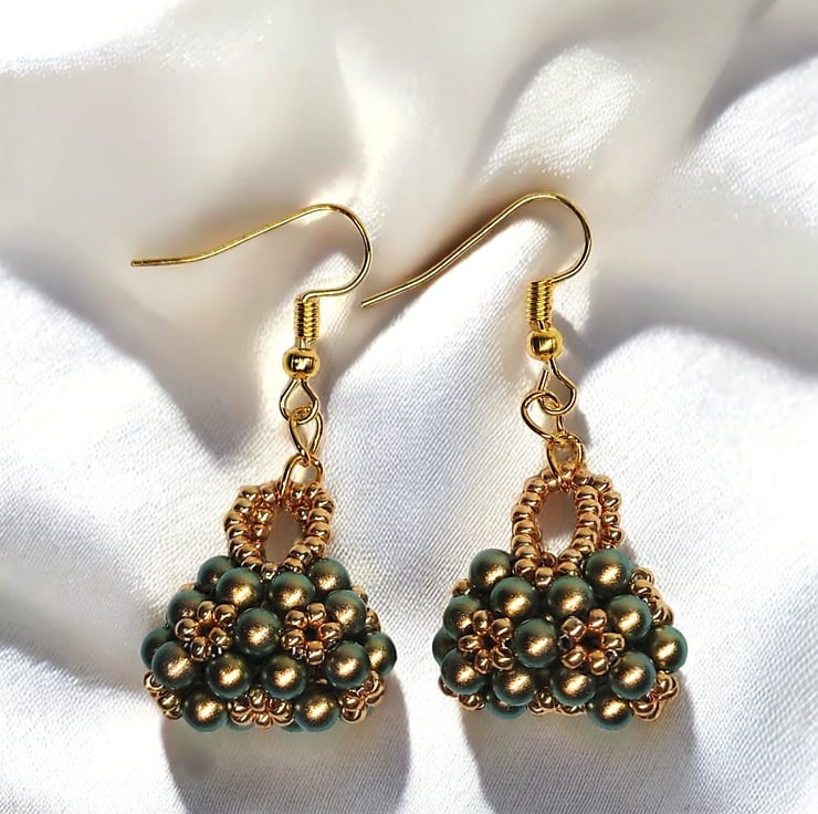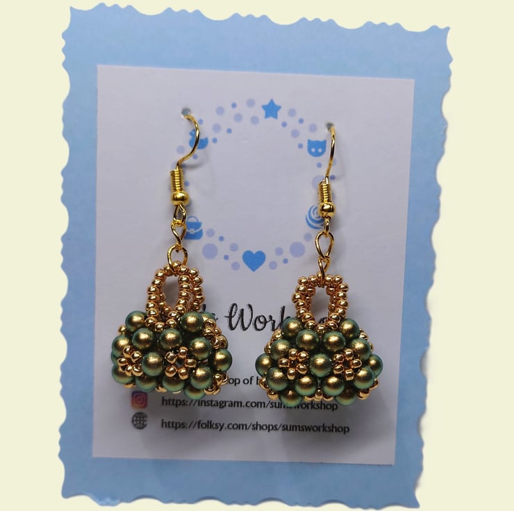 This pair of lovely earrings feature a floral pattern reminiscent of a bucket bag, crafted using grey swarovski crystal pearls and seed beads. The design is sleek and compact, mirroring the rounded bottom and cinched top characteristic of the bucket bag.