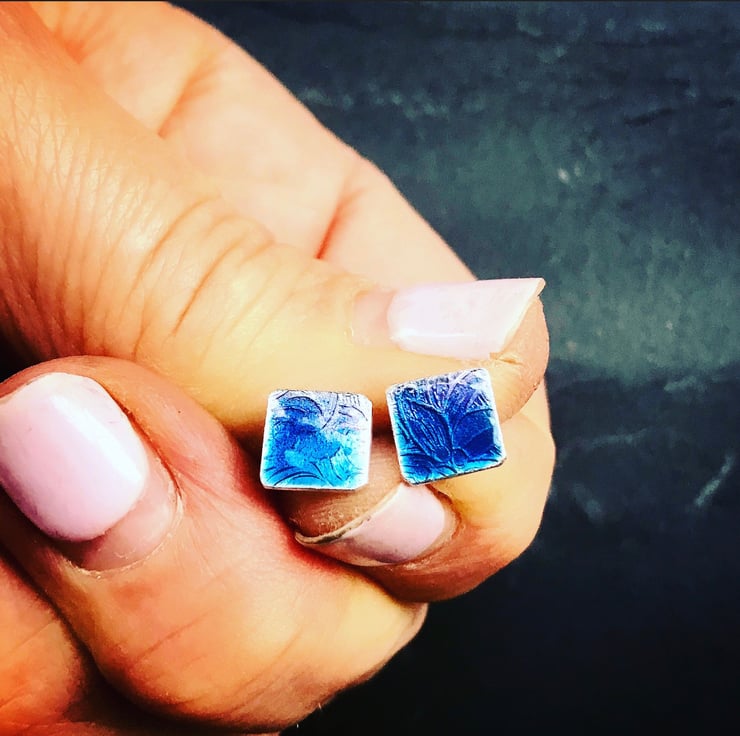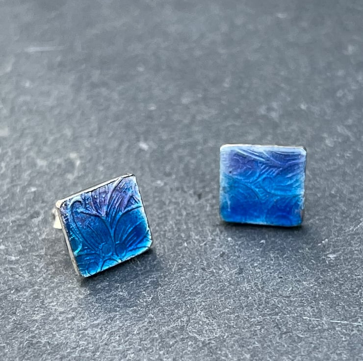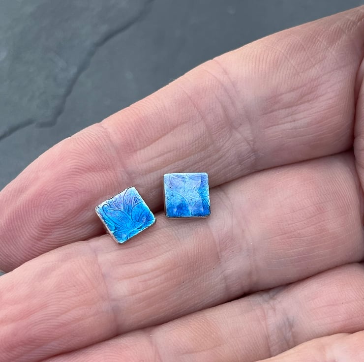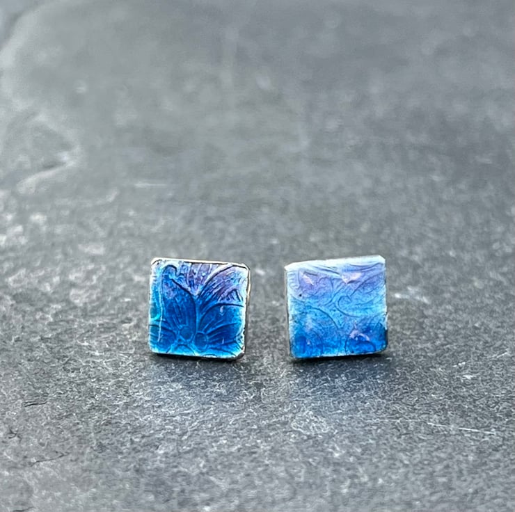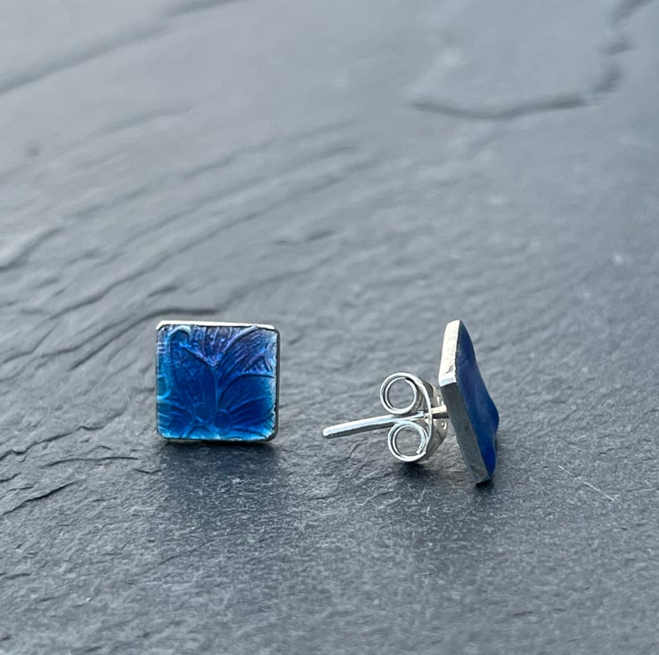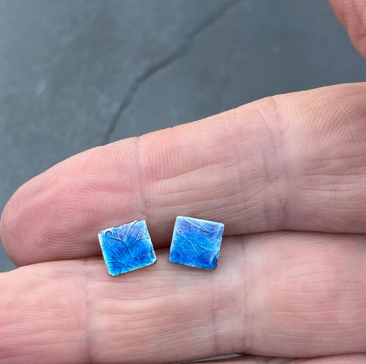 These enamel studs are made from Sterling Silver. There is a beautiful texture on the silver which is visible through the blue and violet blue transparent enamels. They measure approximately: 1cm square. The back of the stud earrings are shiny smooth silver and the posts and push on backs are also Sterling silver.