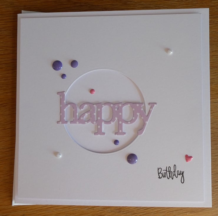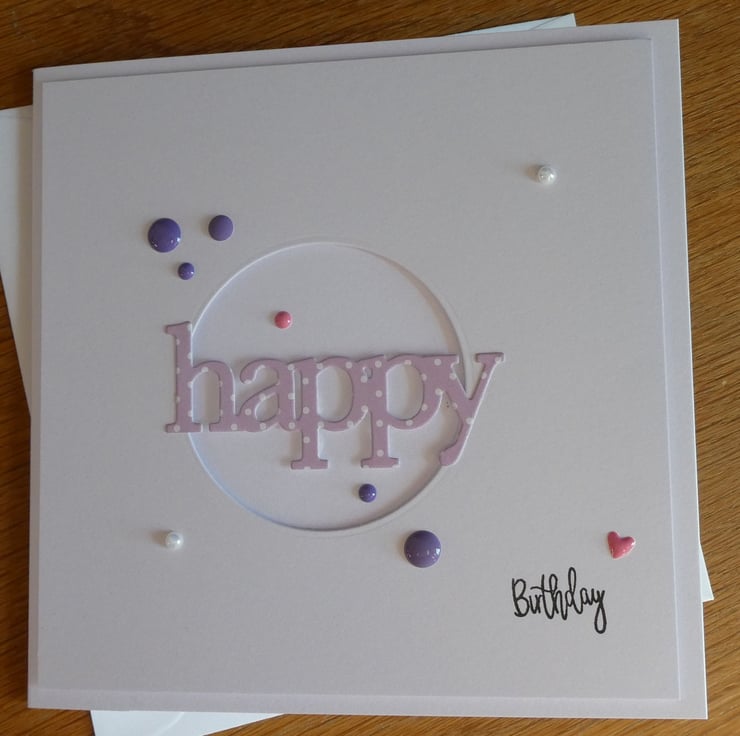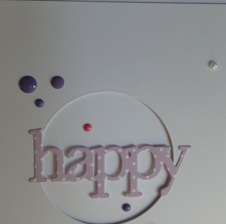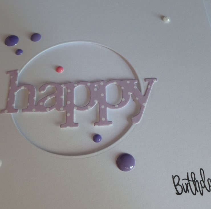 This Birthday card has the word 'happy' cut from lilac and white polka dot card over a circular aperture which has been die cut by hand into a square of quality white card and attached with foam pads to raise it from the card front.