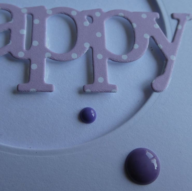 This Birthday card has the word 'happy' cut from lilac and white polka dot card over a circular aperture which has been die cut by hand into a square of quality white card and attached with foam pads to raise it from the card front.