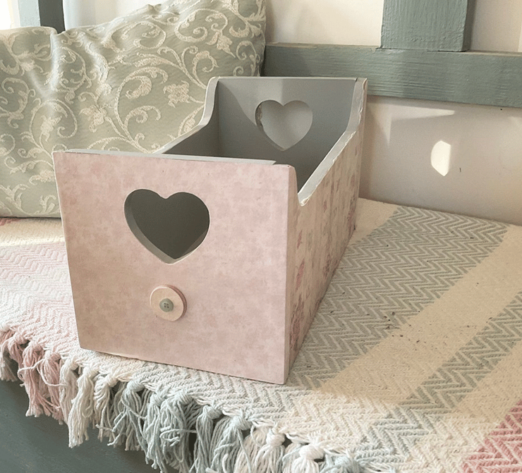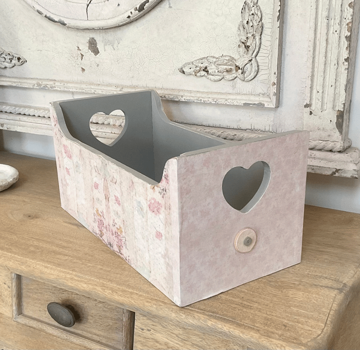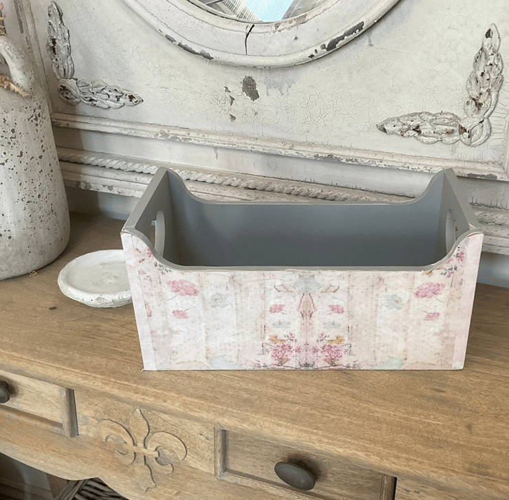 A useful wooden storage box decoupaged in pretty vintage co-ordinating papers on both sides and ends. Distressing, paper rubs and scuffs, shading are all deliberate to give an aged appearance.