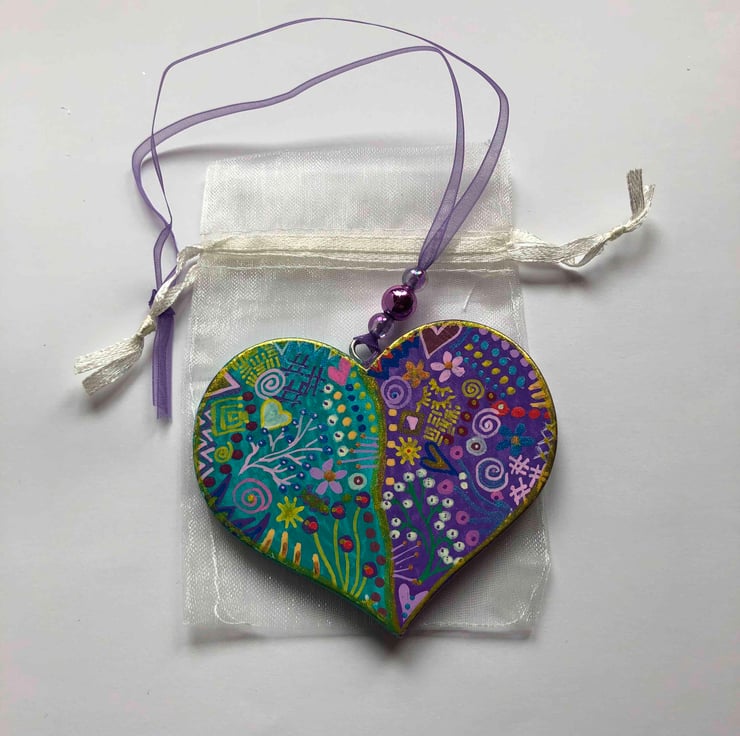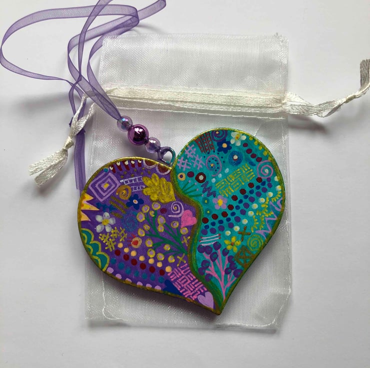 Both sides of this wooden heart have been hand painted in a variety of colours and varnished.