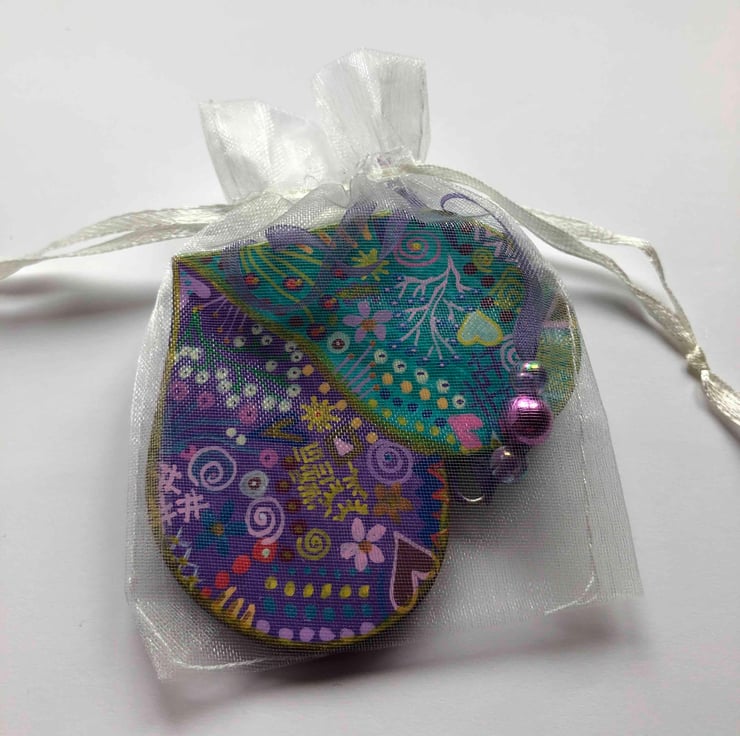 This hearts hangs by a purple organza ribbon attaching 3 beads in pink, and 2 in silver/purple