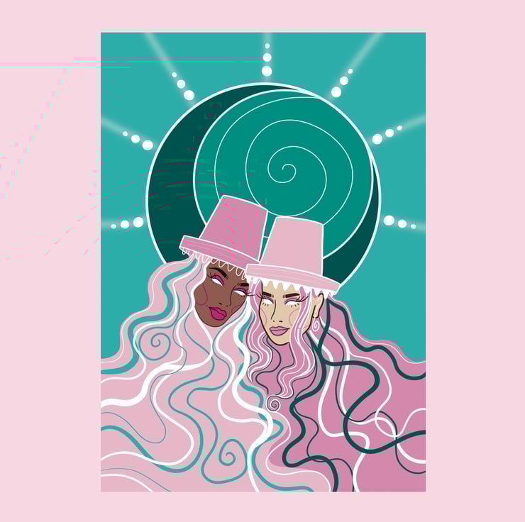 The moon and sun representing the universe and how it connects us all. Also showing love and homage to my Welsh culture with the traditional hats.