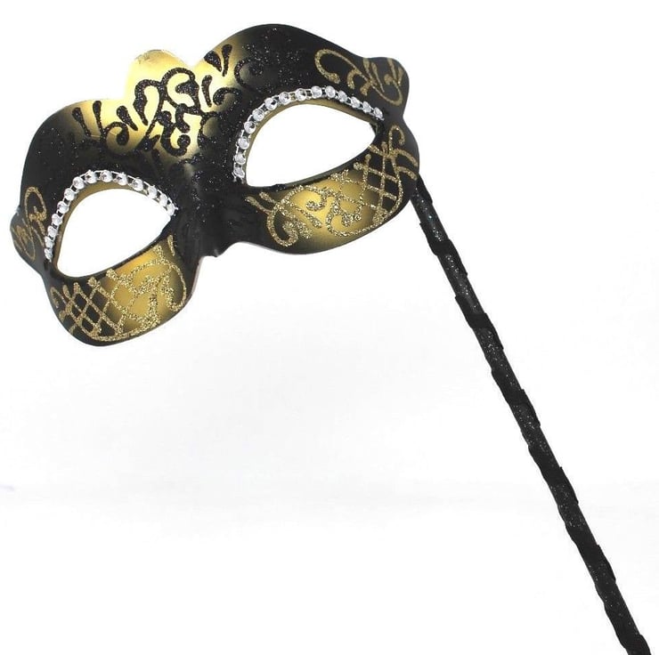 Stunning black & gold mask attached to a handheld wooden stick.