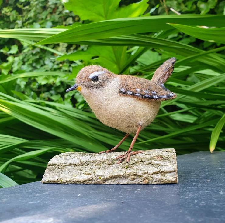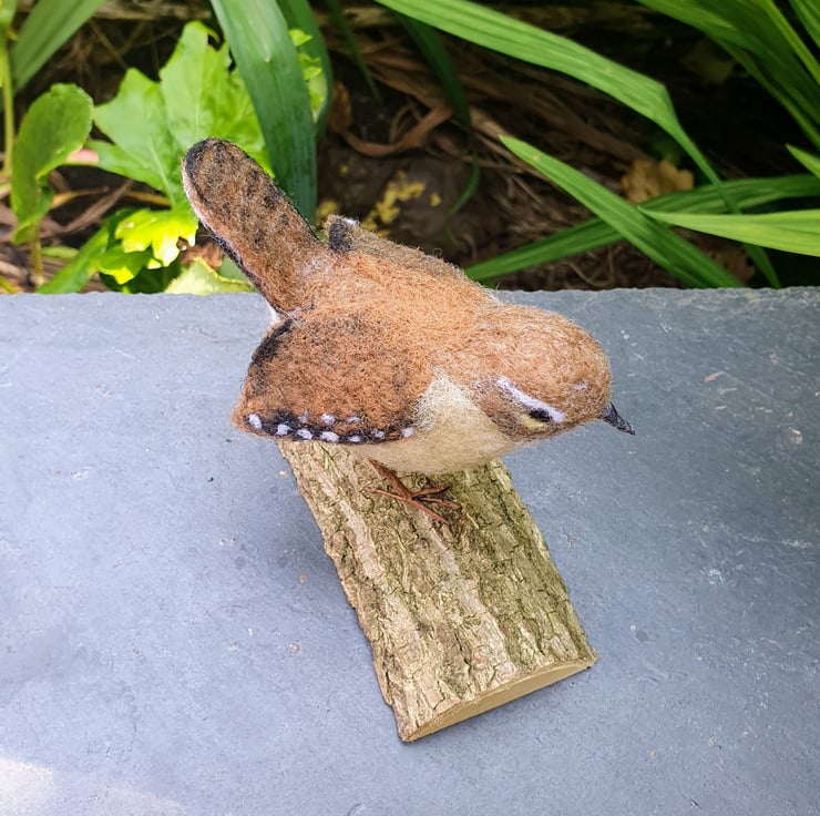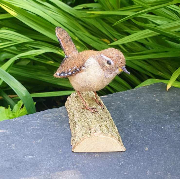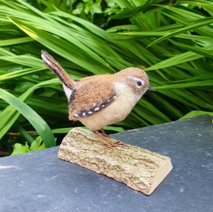 A realistic needle felted wren perched on a natural wooden base.