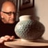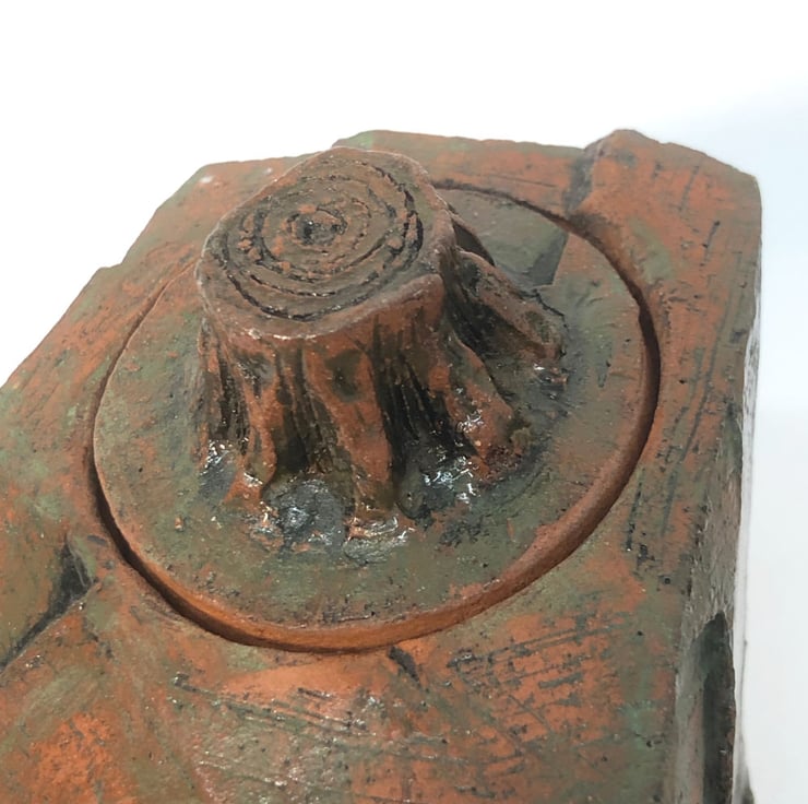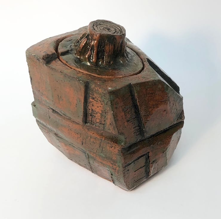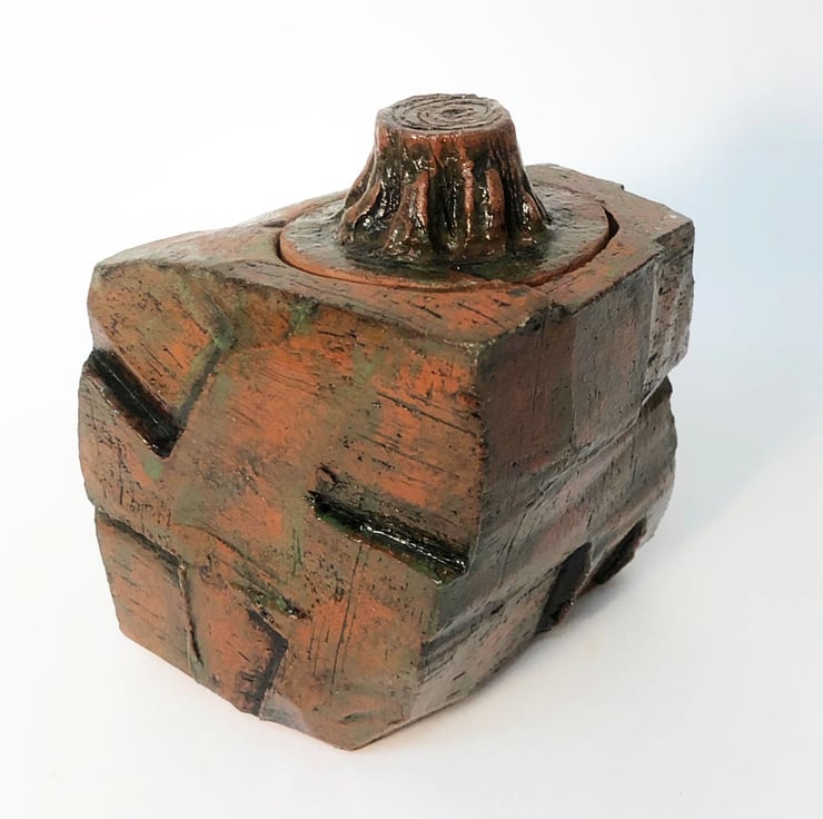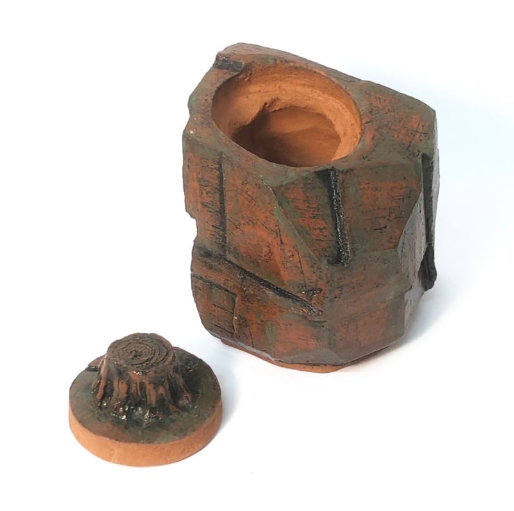 A small-sized lidded terracotta clay pot inspired by riverside red sandstone rock formations local to the makers home.