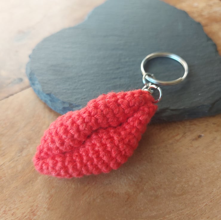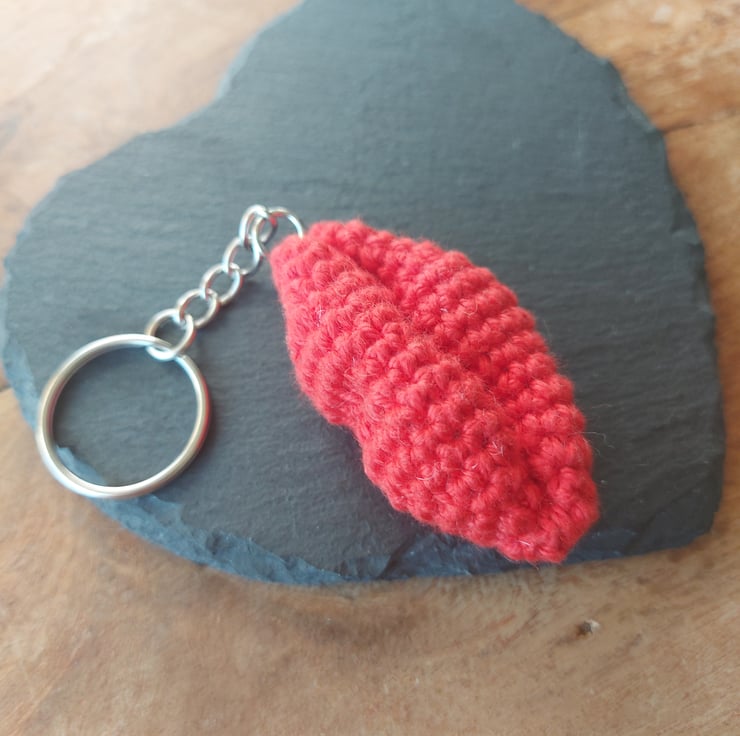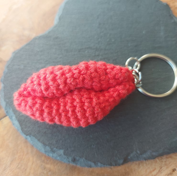 A handmade crochet keyring made with red cotton yarn. Not a toy. Not suitable for children. Lips are 6cm wide.