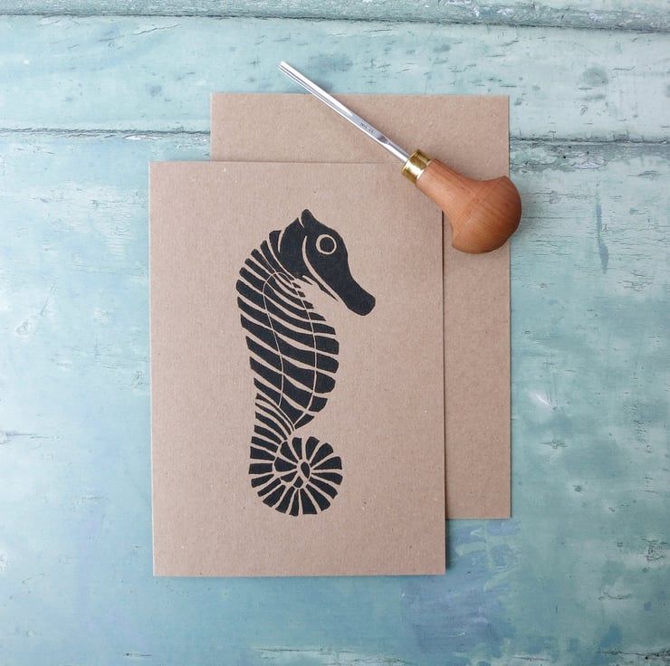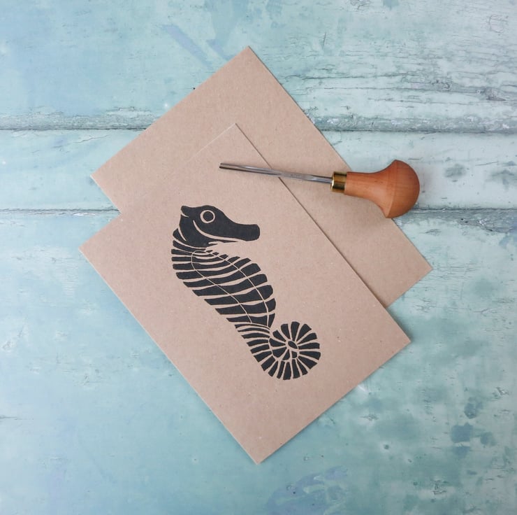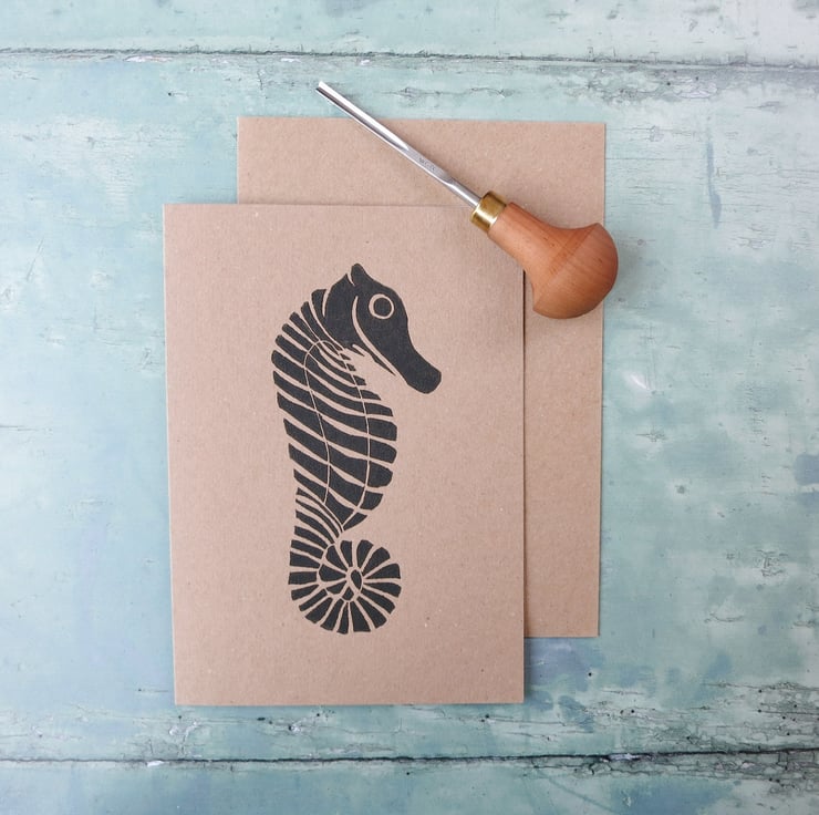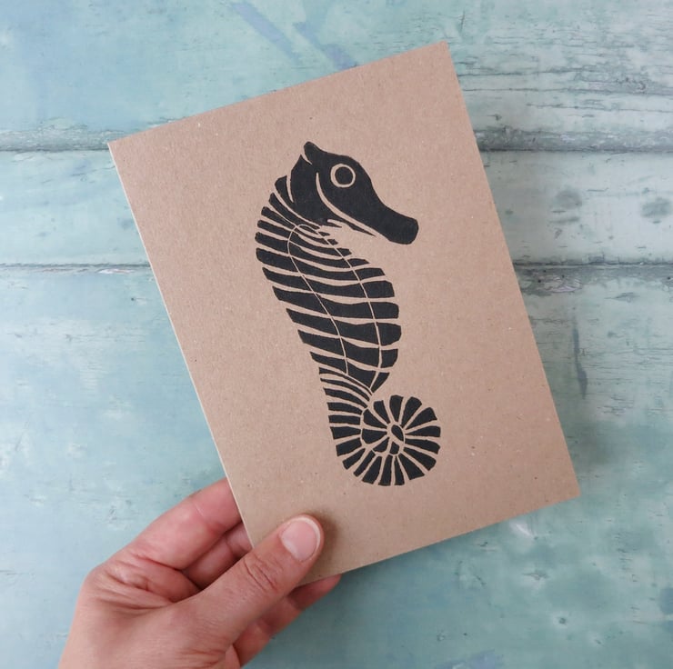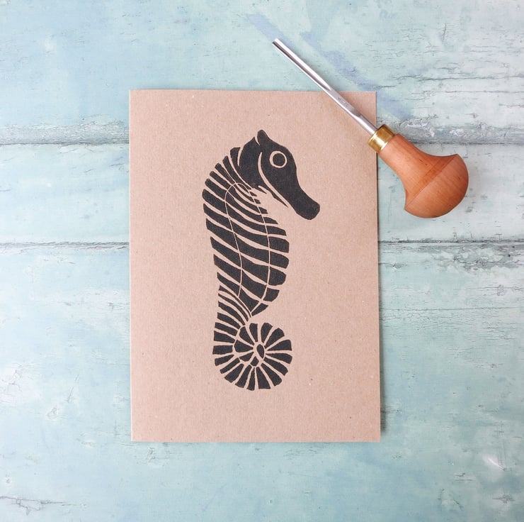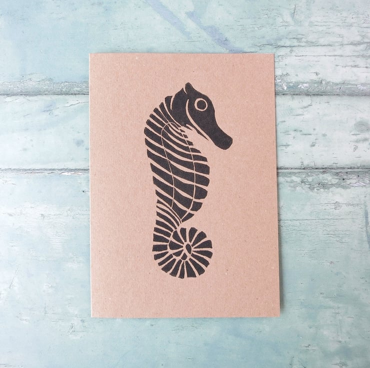 Original Lino print of a Seahorse. Hand printed on recycled Kraft card using water based ink.