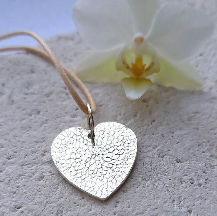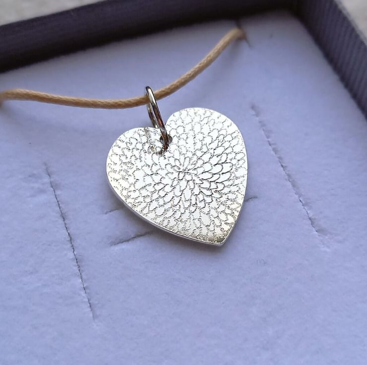 Solid 9ct white gold heart shaped pendant, hand engraved with a gorgeous design inspired by the chrysanthemum flower.