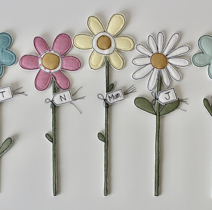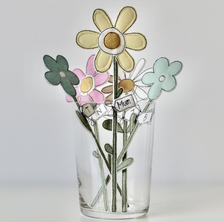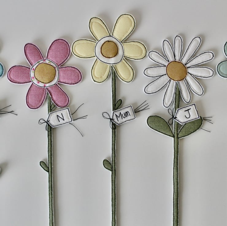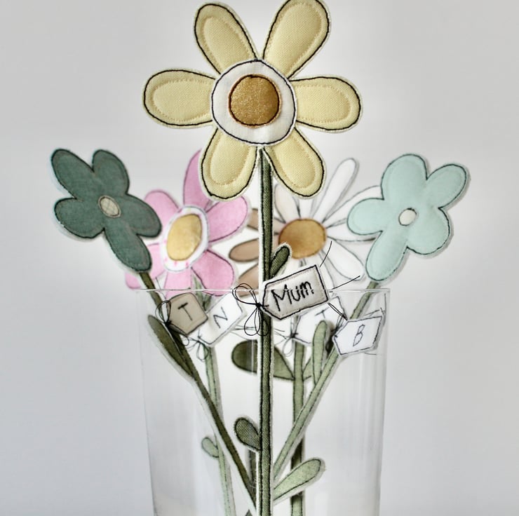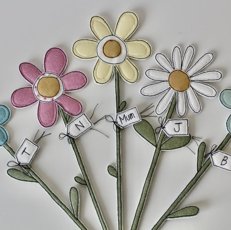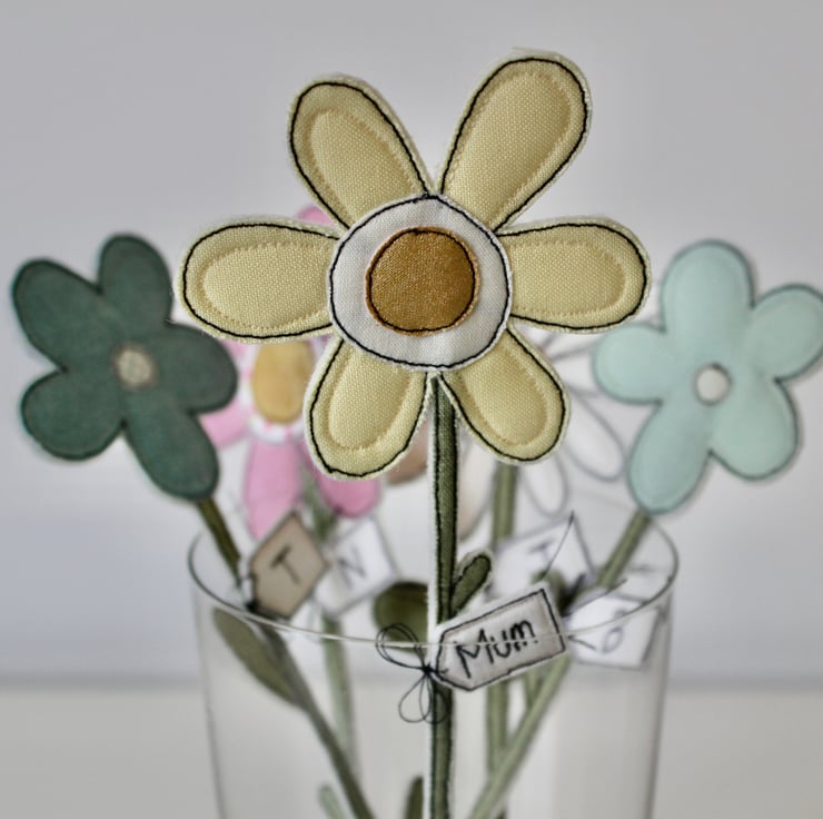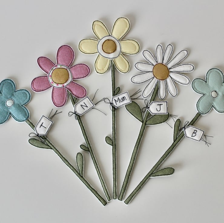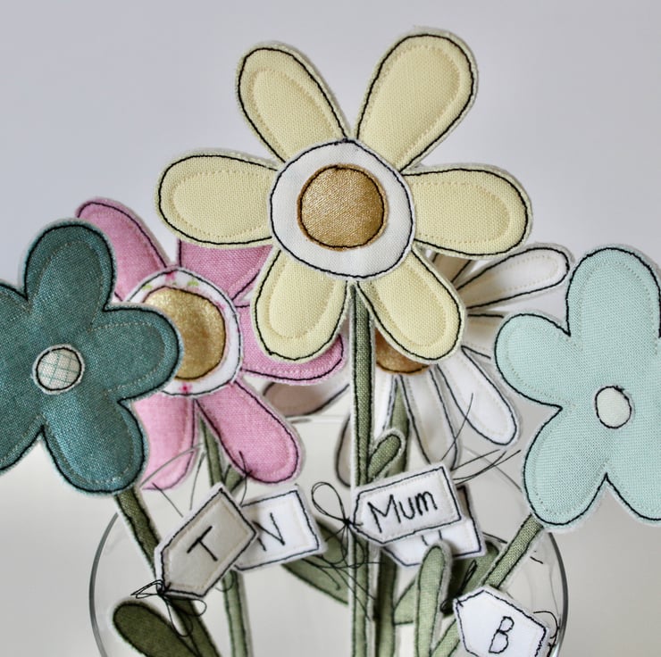 Each of the handmade flowers is sewn using cotton cloth, 100% wool felt and free hand machine embroidery; multiple layers of cloth are sewn together and cut out by hand using very sharp scissors.