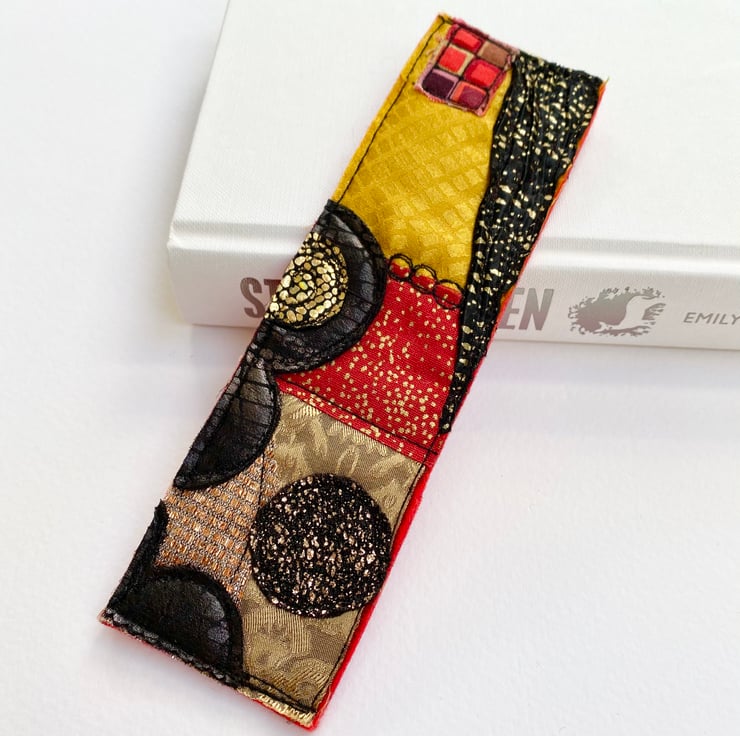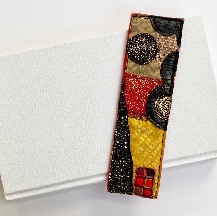 This striking abstract pattern bookmark has been enhance with free motion embroidery. It measures 5 x 17.5cm and is felt backed.