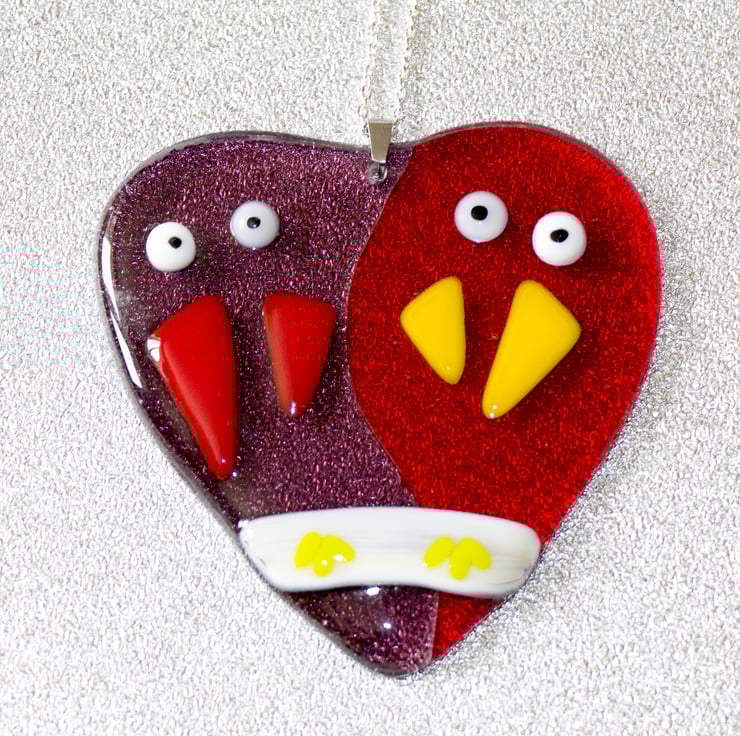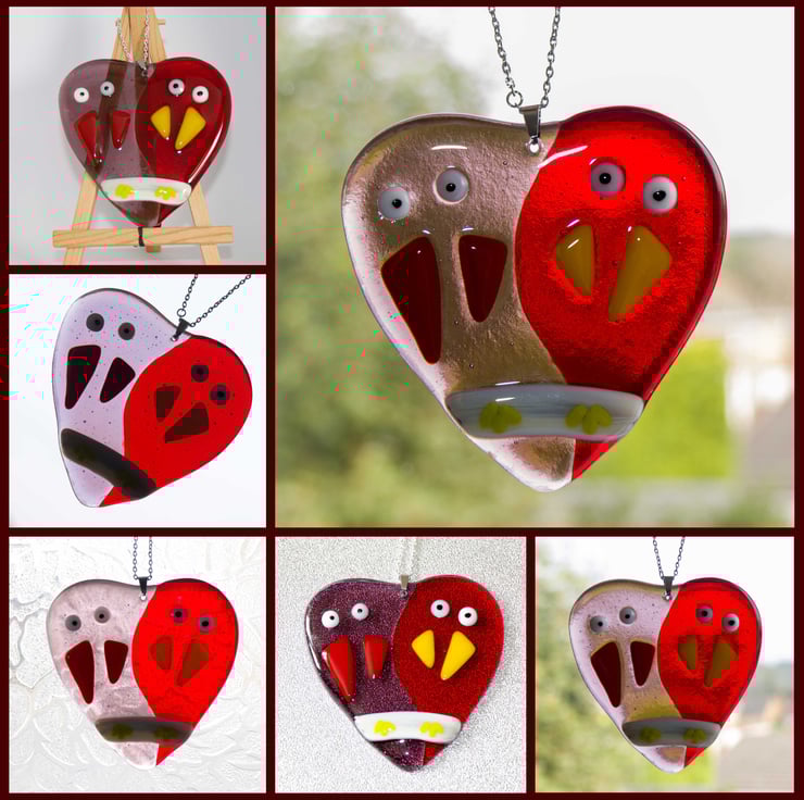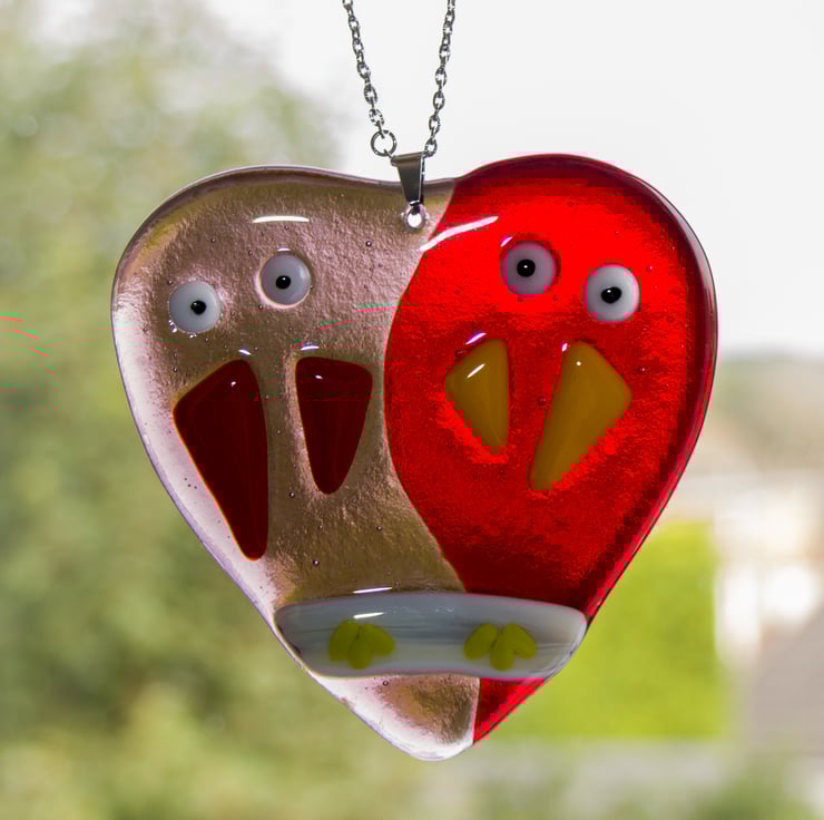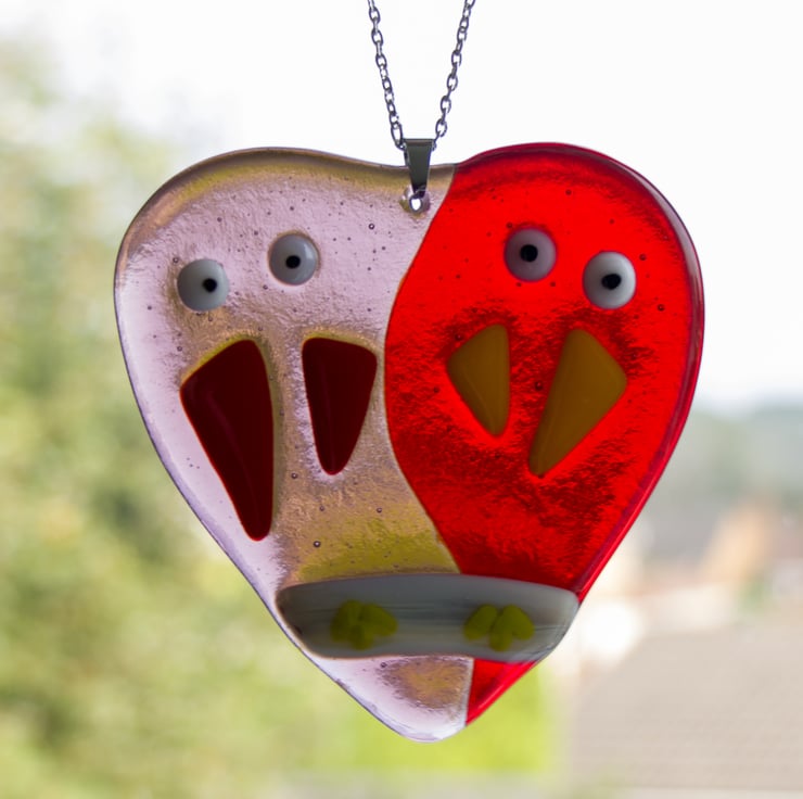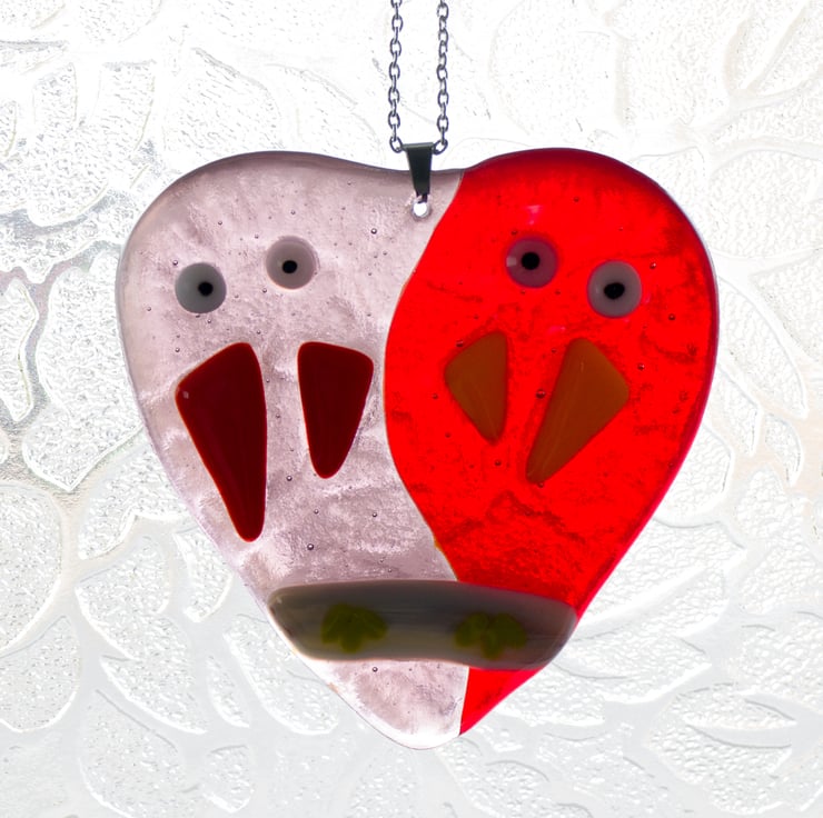 This pair is made from two pieces of coloured glass which have been hand-cut to shape and capped with a third piece of clear class. Their eyes, wings and beaks are created from pre-prepared pieces of glass, and the branch is added (with tiny feet) before firing in the kiln to around 800C. When they are cooled we drill a hole and attach a length of stainless steel chain from which they hang.