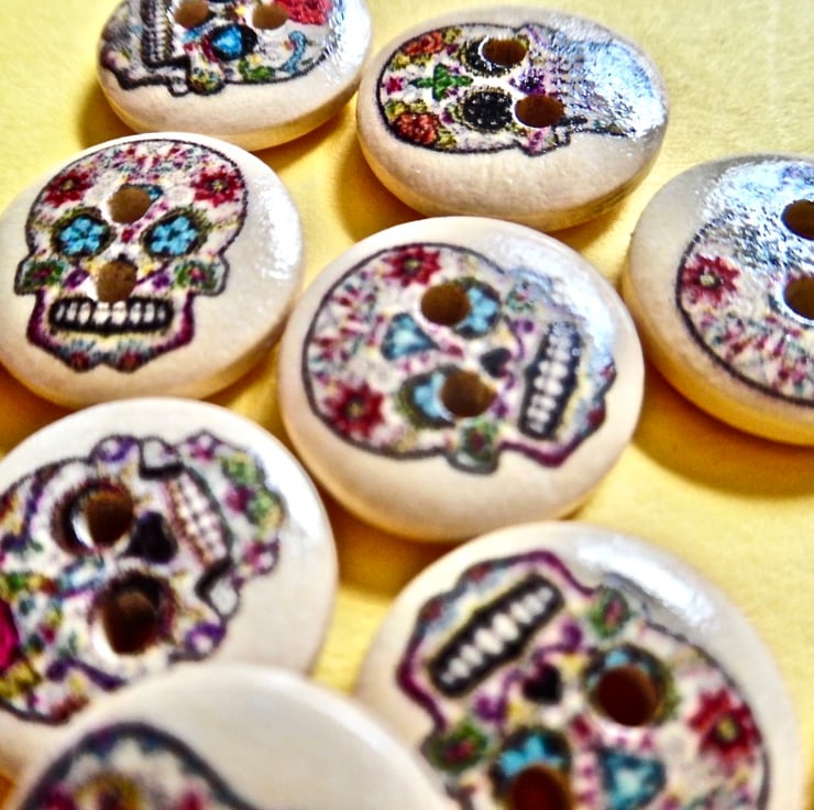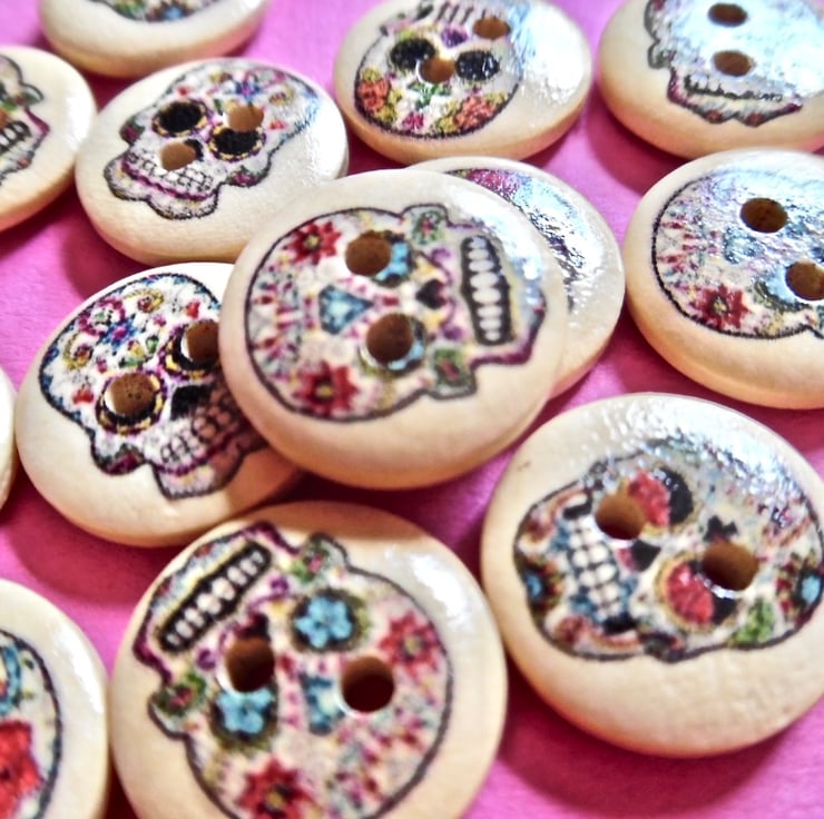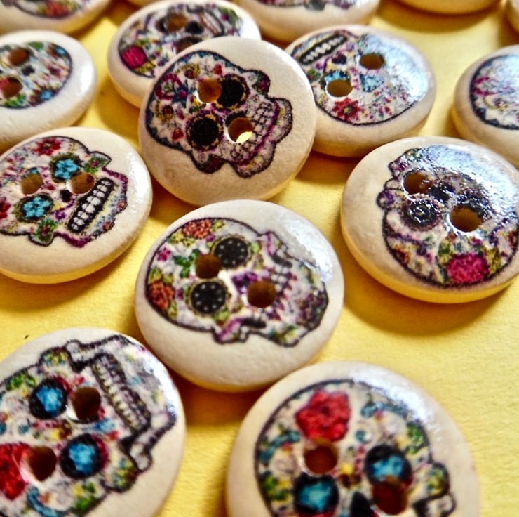 10 x  Wood  Skull Printed Round Buttons  2 holes