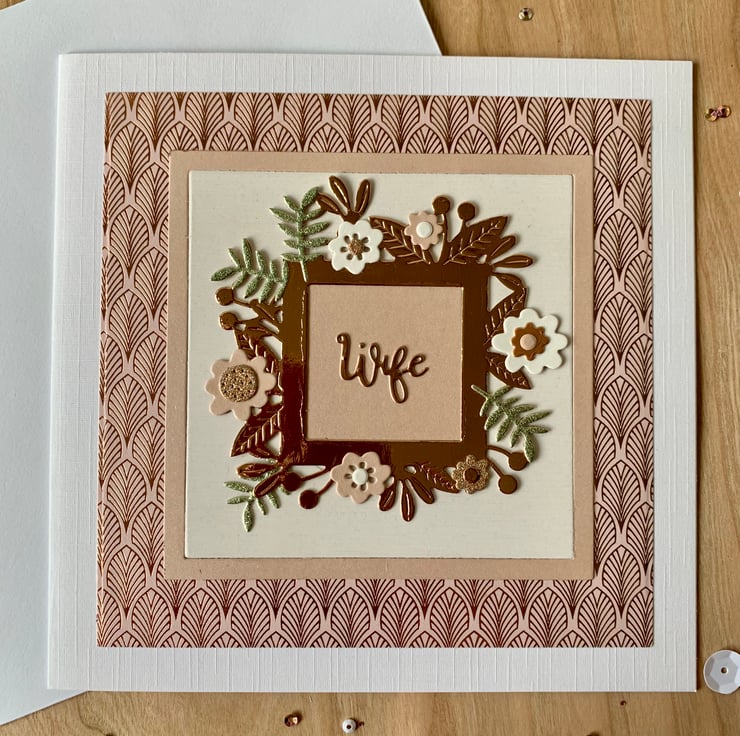 The main feature of the card is made using a beautiful die cut floral frame which is set against a lovely rose gold pattered background.