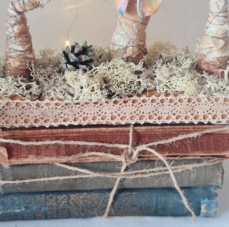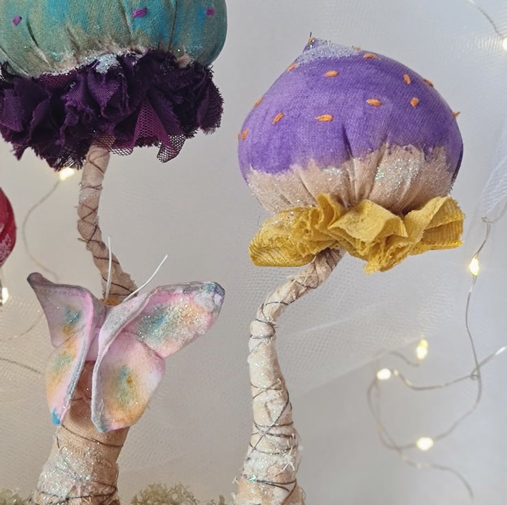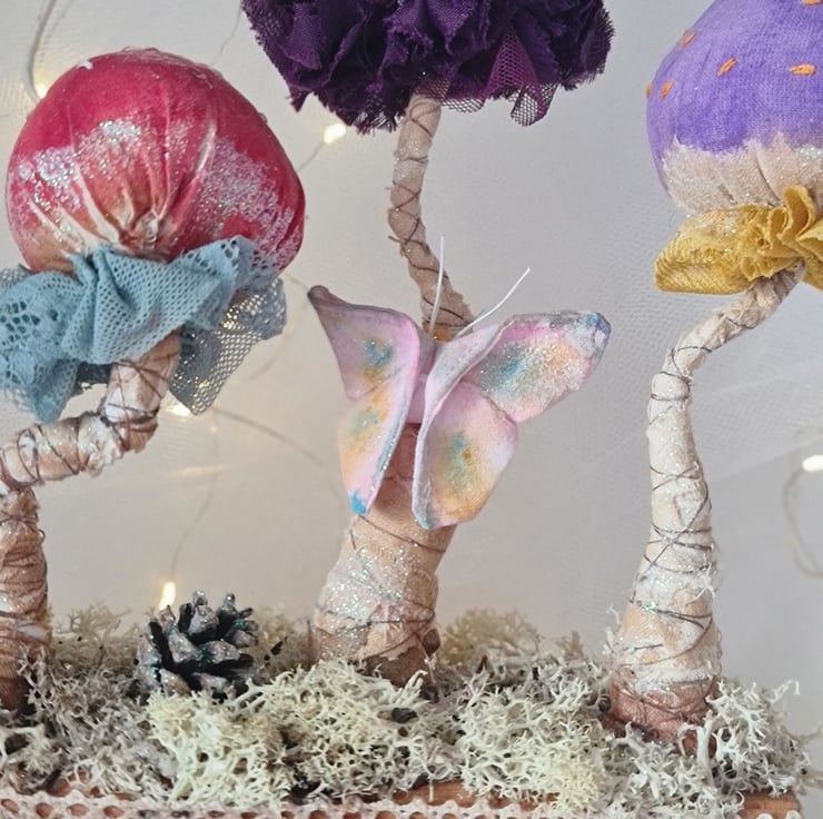 A beautiful enchanted still life, is hand and machine stitched in unbleached cotton. Hand painted and stained.embellished with vintage stye lace and embroidered spots in contrasting colours. A hand dyed and painted butterfly sits among the toadstools, which, stand on a bed of dried moss.