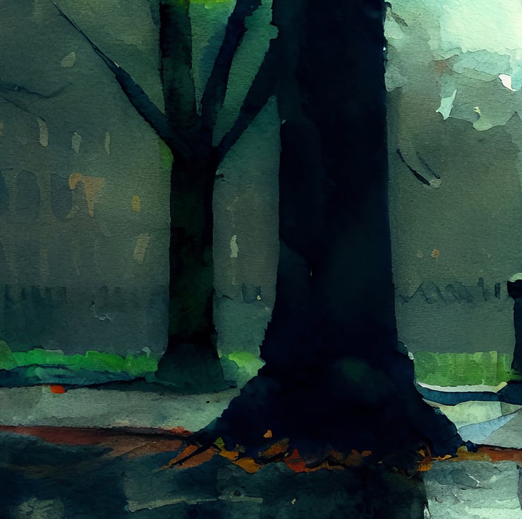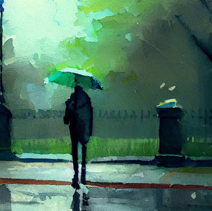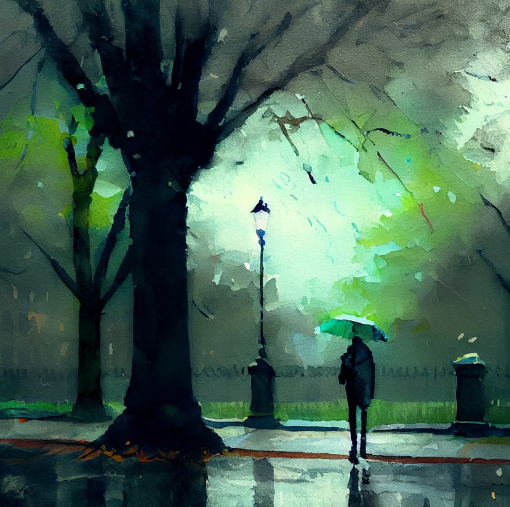 Experience the tranquility of a rainy day in the city with our watercolor print featuring a man walking through the rain on an urban street lined by trees. This piece captures the calm and peaceful atmosphere of an urban landscape, making it a thoughtful addition to any room.