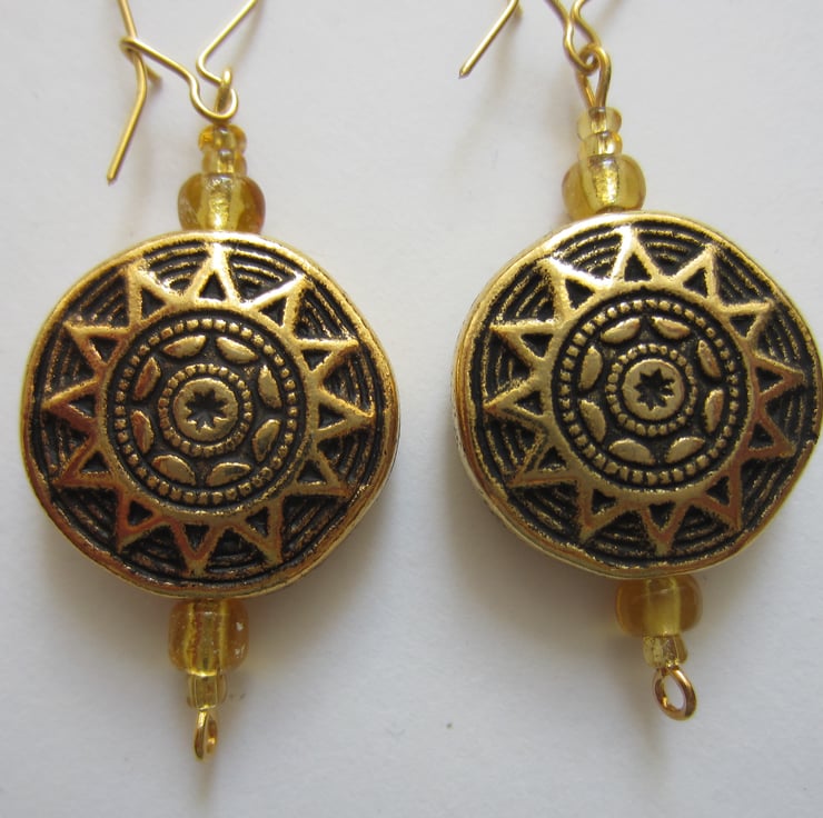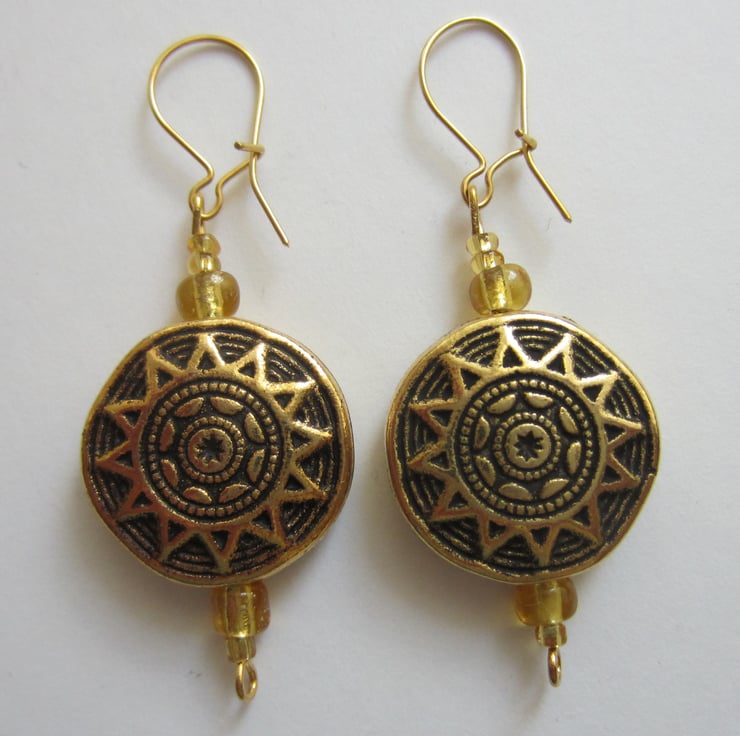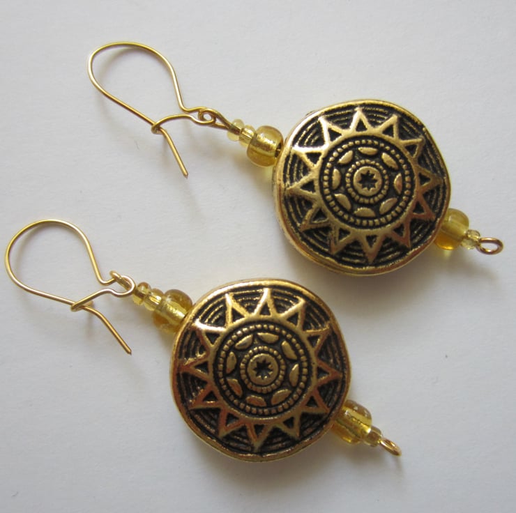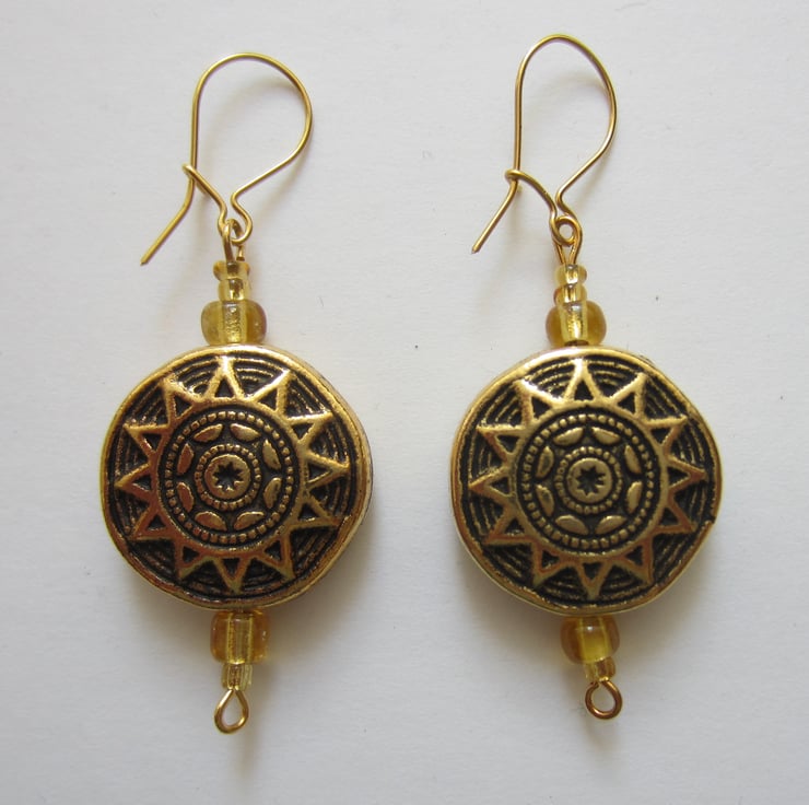 Dangle earrings made from gold coloured large sun beads and other gold colour beads. They hang from gold plated kidney shaped ear wires.