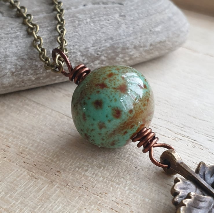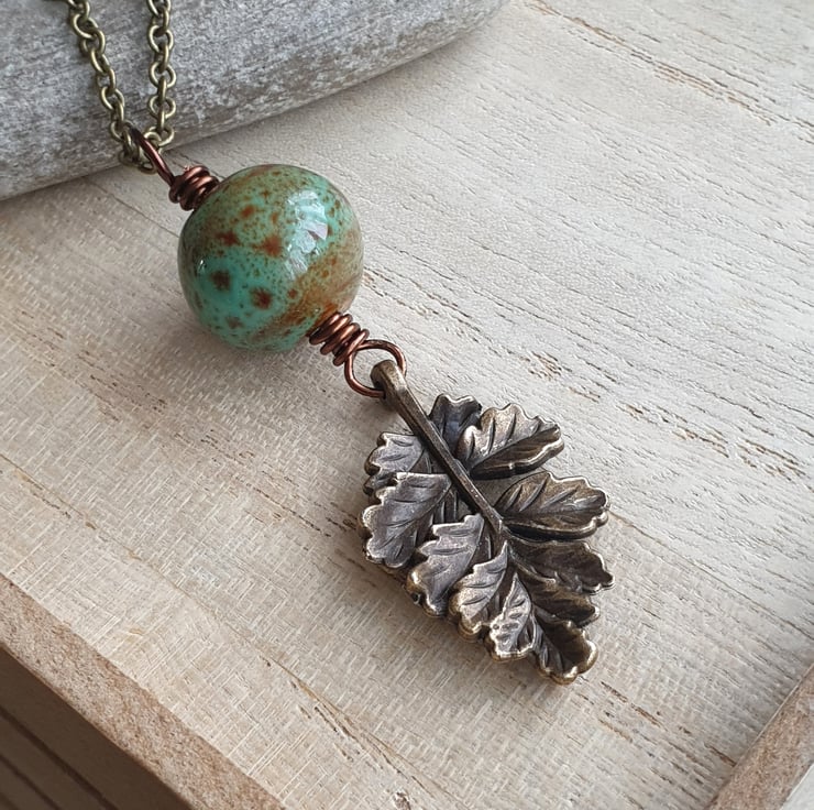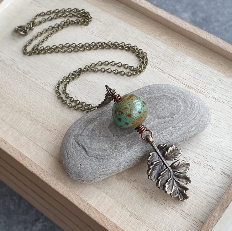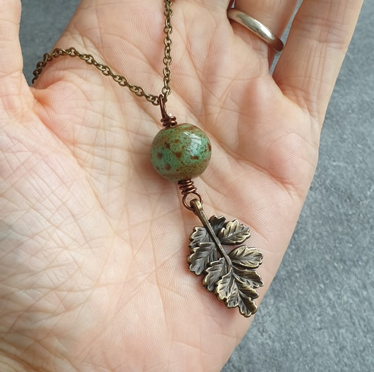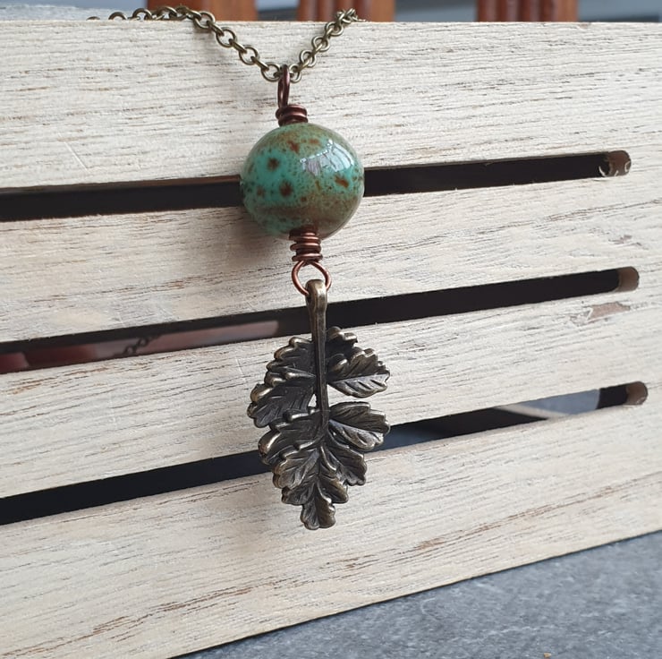 This pretty brass oak leaf necklace features a detailed brass oak leaf which hangs below a handmade ceramic bead in mossy green with amber mottling. The green and bronze pendant hangs from an antiqued bronze trace chain in your choice of length and fastens with a lobster claw clasp.