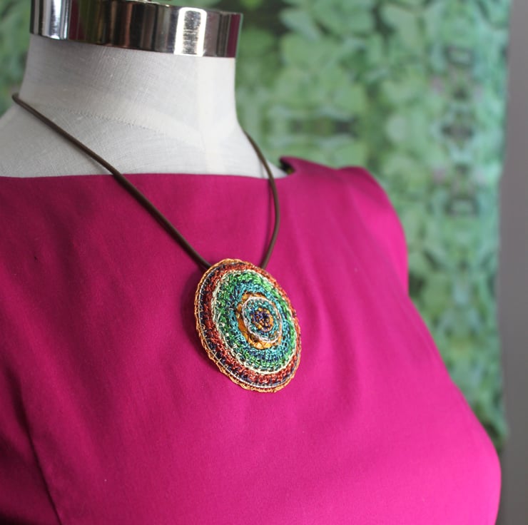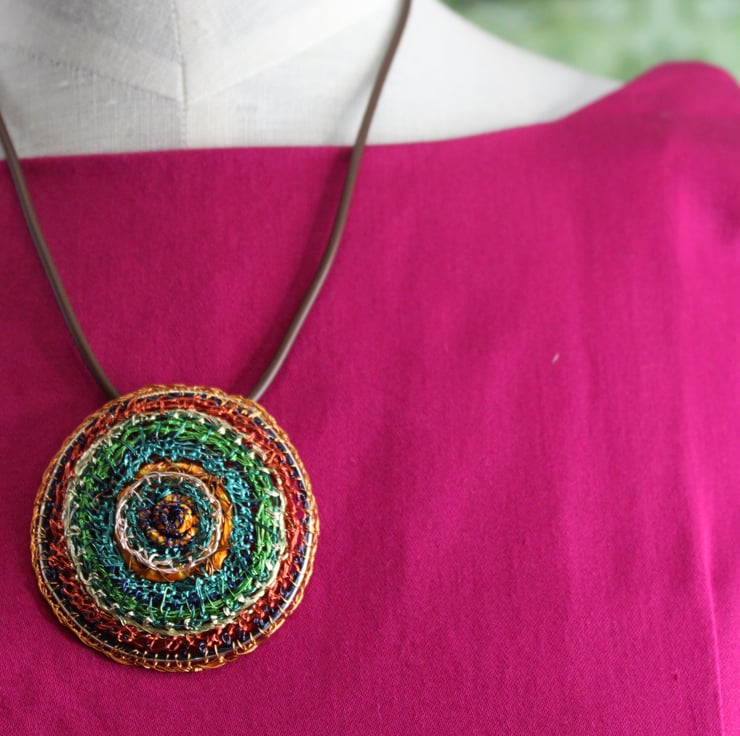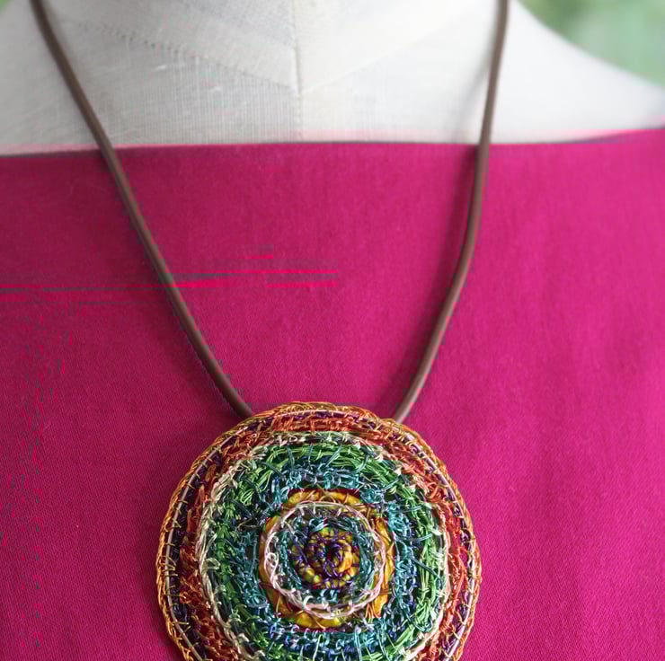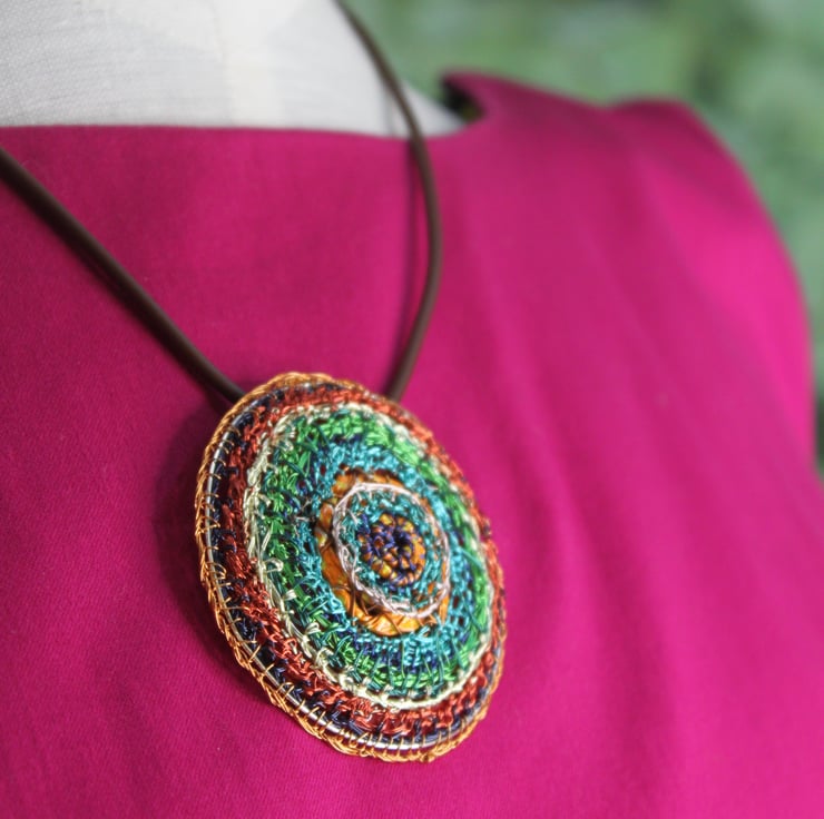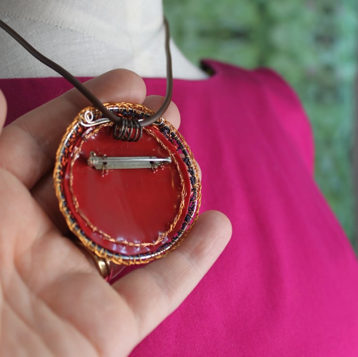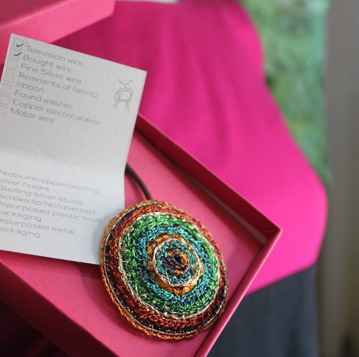 Recycled brooch pendant from recycled materials handmade in UK by Alison Bailey Smith in Wirral and presented in a vibrant pink box, making it a perfect gift for those interested in sustainable style. The convertible brooch is made from wire reclaimed from old televisions, re-purposed plastic from packaging (Chocolate Orange wrappers plus red plastic from conditioner tubes) and repurposed metal with silver plated wire recovered from another craftsperson, and can be worn with supplied brown rubber cord with silvery fittings. A recycled spring provides the means to attached the ribbon. One piece of jewellery that can be worn in two different ways.
