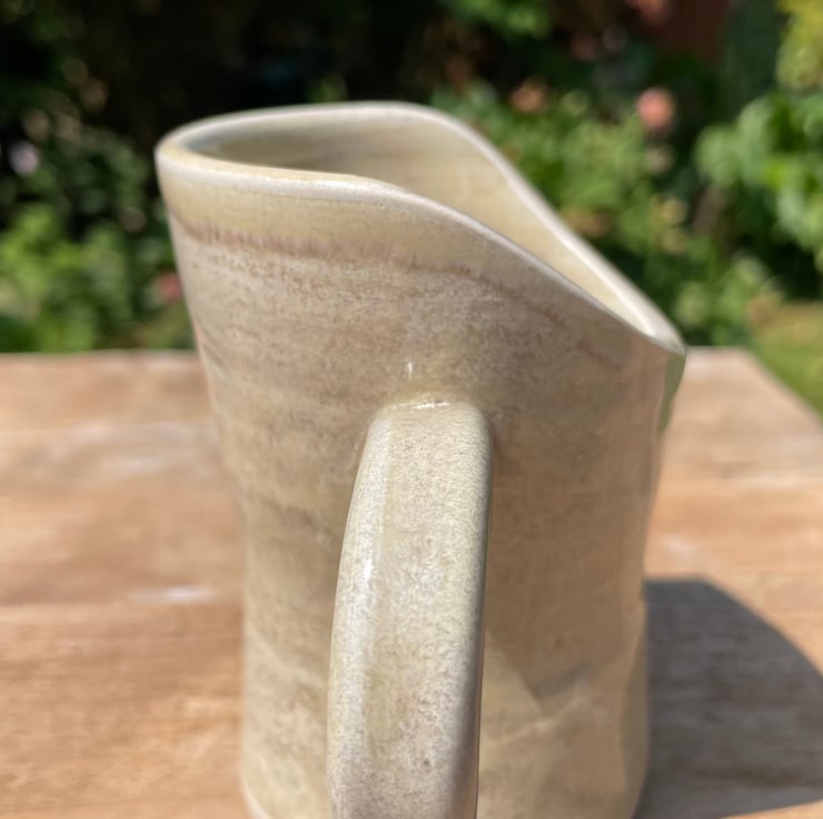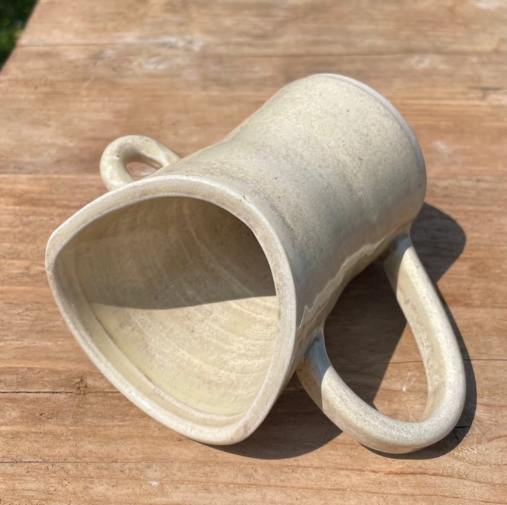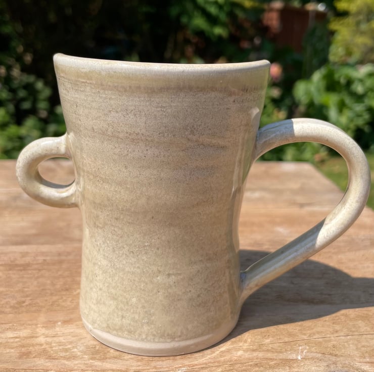 The mug was dried slowly once the handle was added, over a few weeks. It was then fired to over 1000°c in a bisque firing. It was then glazed and fired again over 1200°c.