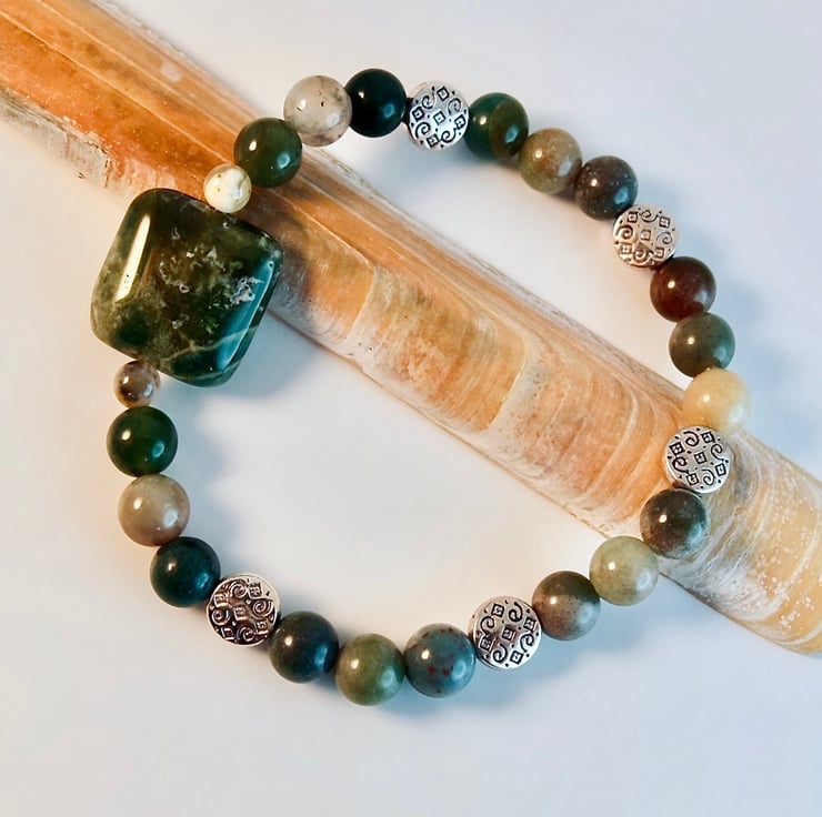 These Fancy Jasper beads show the varied colour palette of this opaque stone - forest greens, rust browns, speckled greys, yellow-amber, cream and hints of mauve.