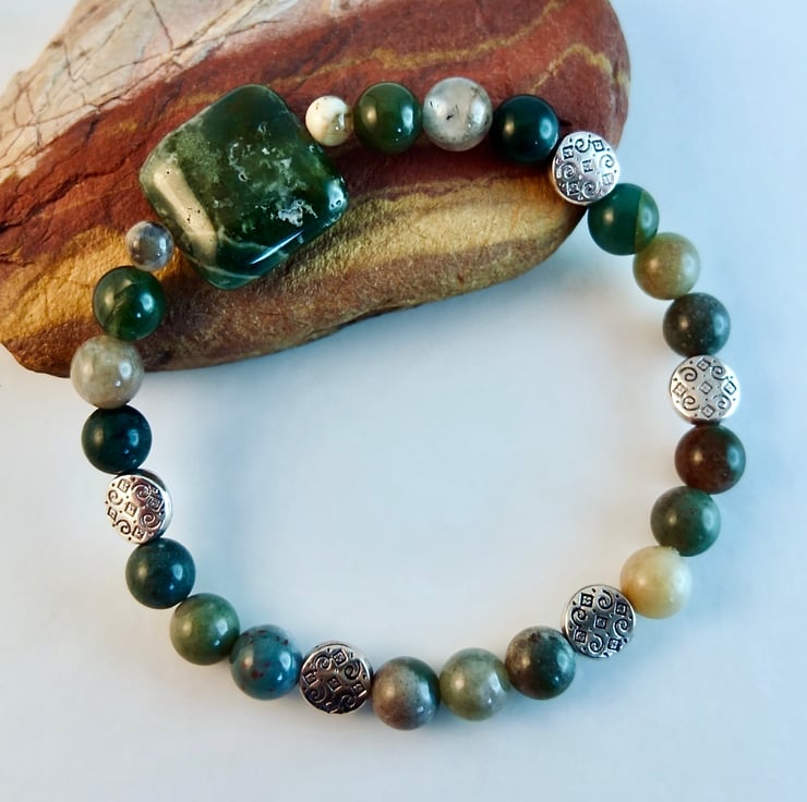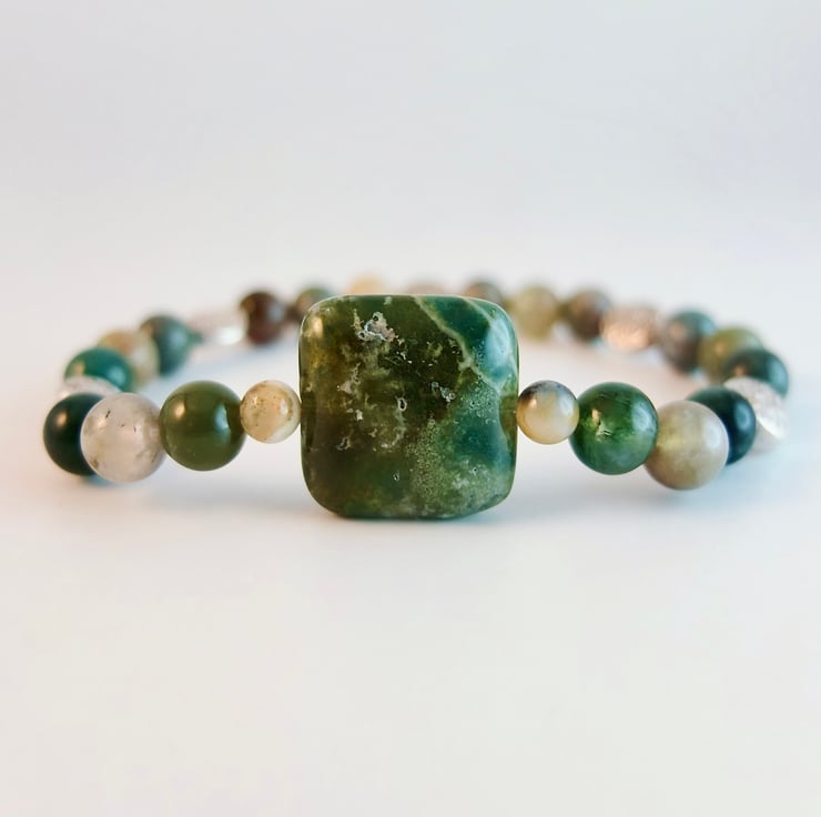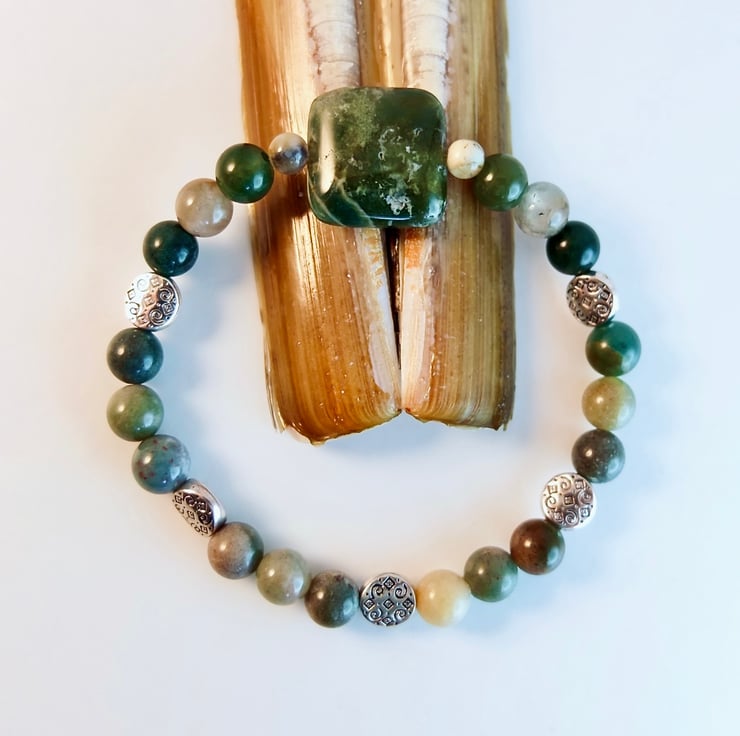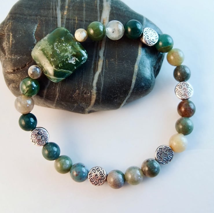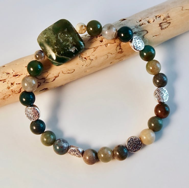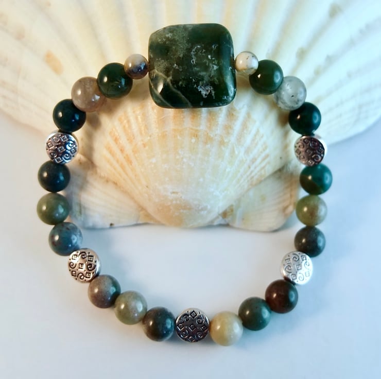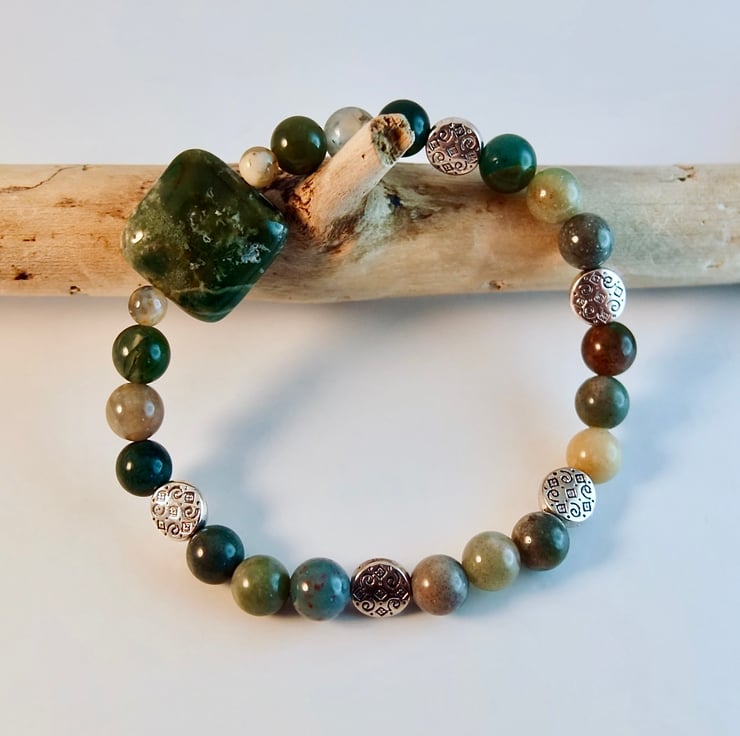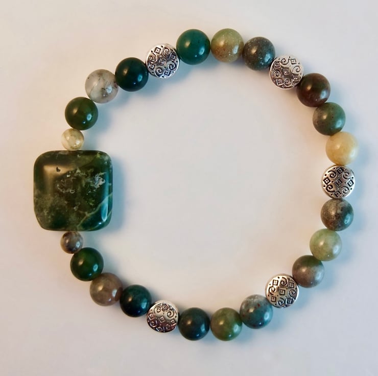 The focal bead is a 16mm square, highlighted with a pair of 4mm beads, set between 6mm beads and embellished with 7mm Tibetan silver discs (nickel and lead free).