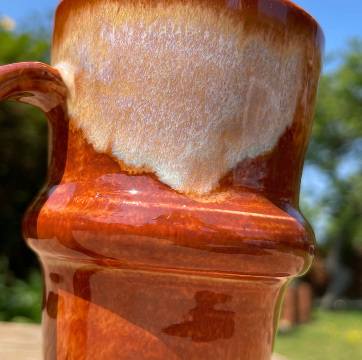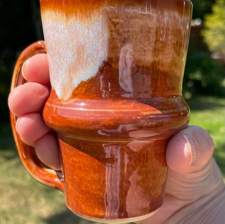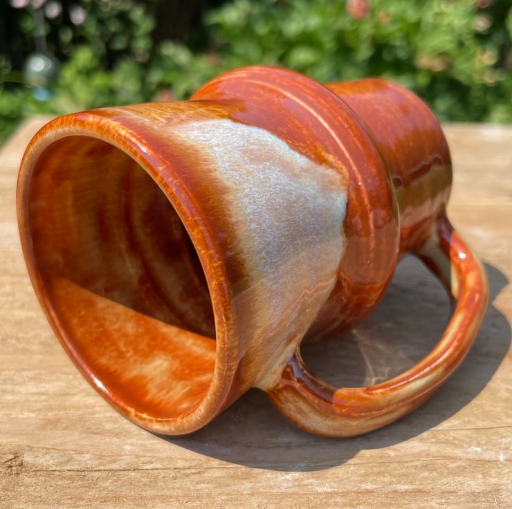 The mug was dried slowly once the handle was added, over a few weeks. It was then fired to over 1000°c in a bisque firing. It was then glazed and fired again over 1200°c.