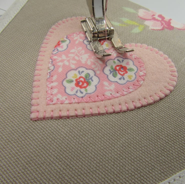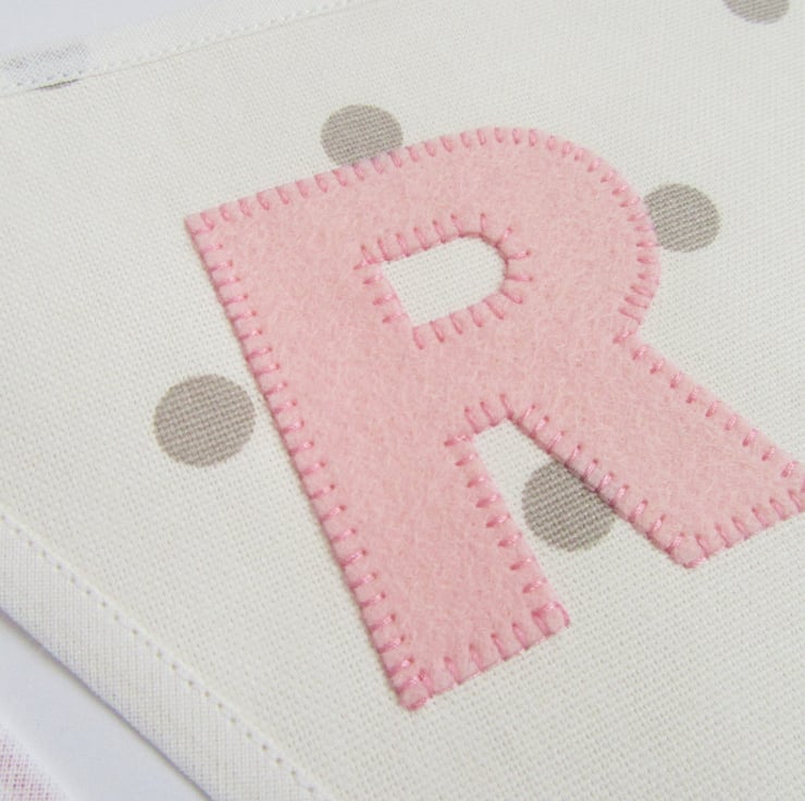 Beautiful hand cut felt letters are appliqued and top stitched in a lovely pink thread.