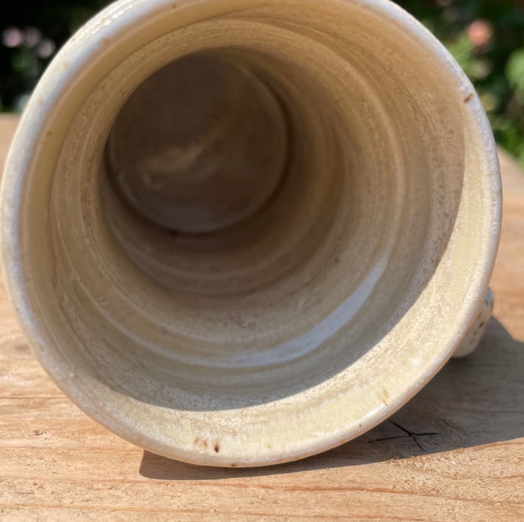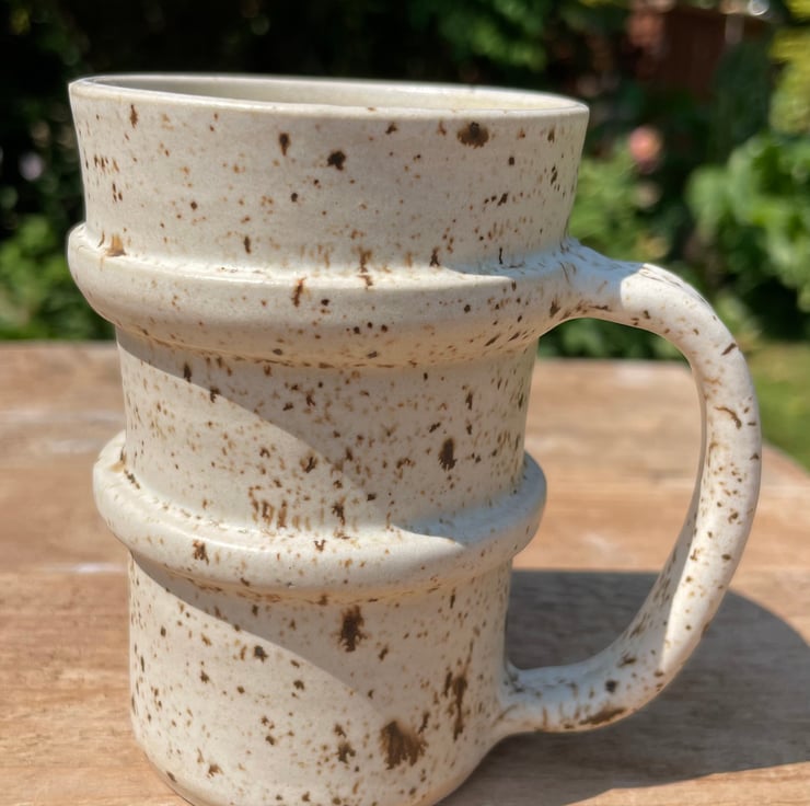 It features a 2 ridges and a squared handle, this is the only one I’ve made in this style. This is to allow the user to lift the mug without support from the other hand. The ridge becomes a thumb support and counter acts the balance, whilst the fingers/hand is inserted into the handle. When using the handle in this manner please ensure that the contents and outside of the mug aren’t too hot to handle before using.
