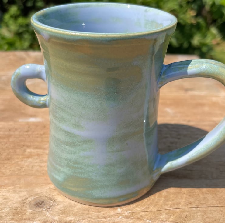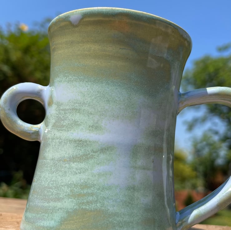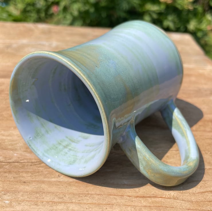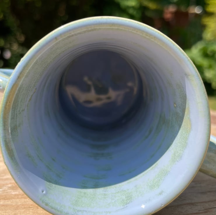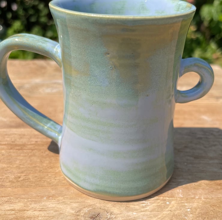The mug was dried slowly once the handle was added, over a few weeks. It was then fired to over 1000°c in a bisque firing. It was then glazed and fired again over 1200°c.