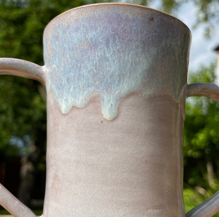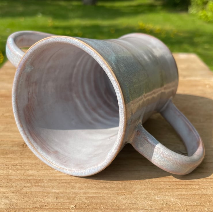 The mug was dried slowly once the handle was added, over a few weeks. It was then fired to over 1000°c in a bisque firing. It was then glazed and fired again over 1200°c.