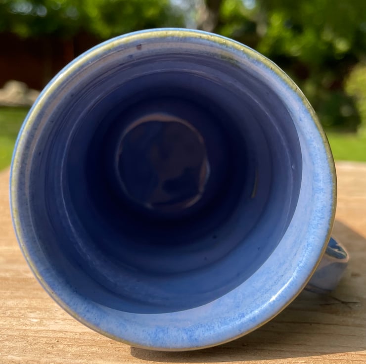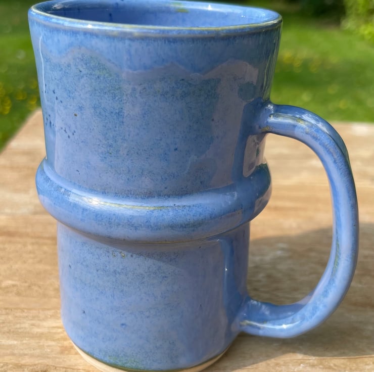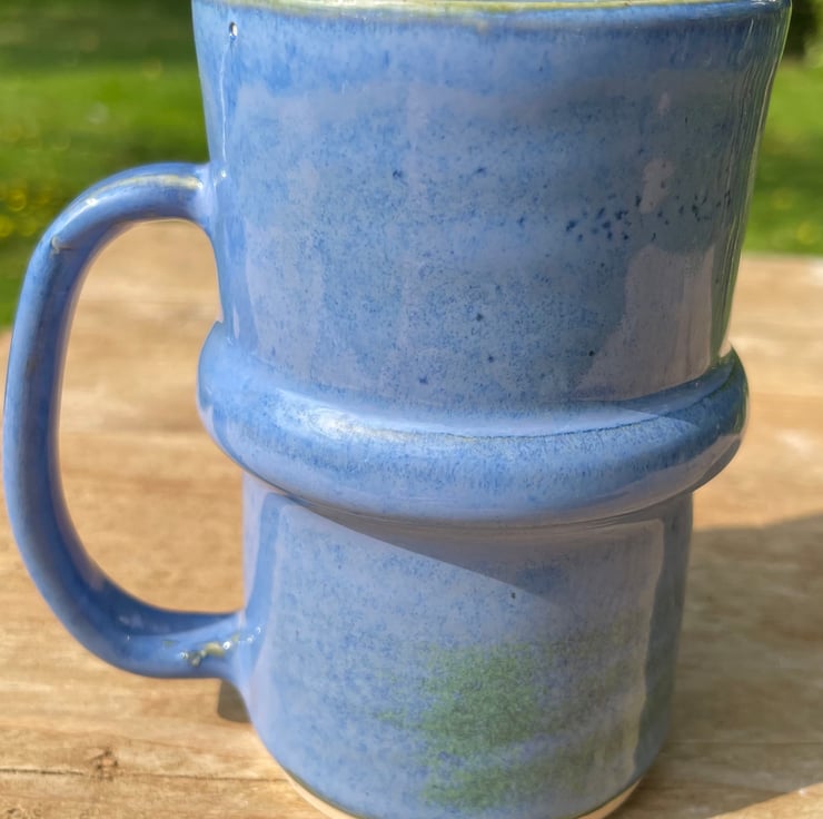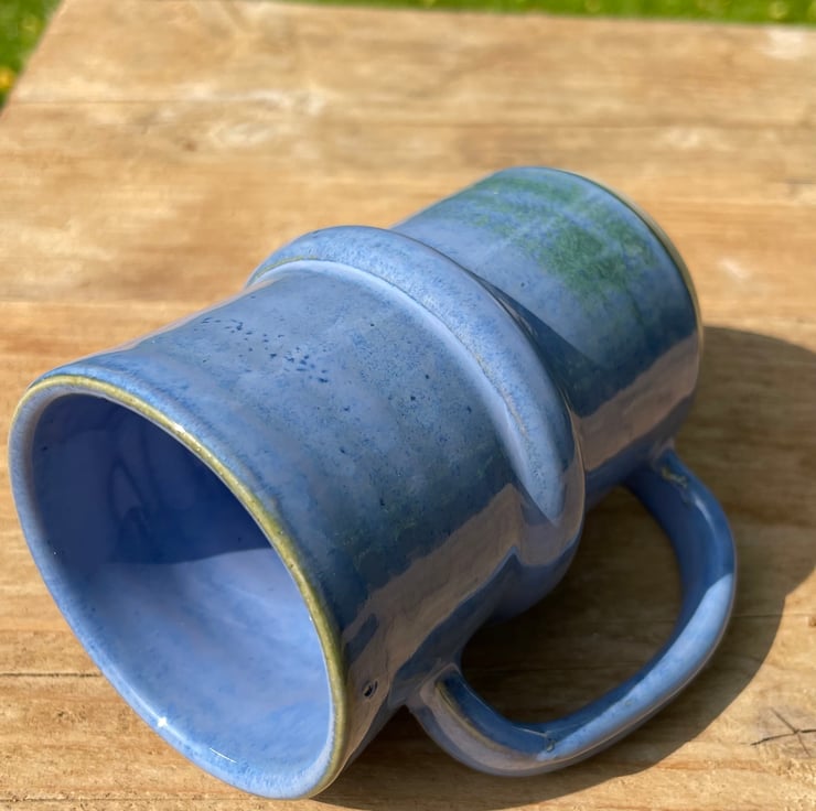 The mug was dried slowly once the handle was added, over a few weeks. It was then fired to over 1000°c in a bisque firing. It was then glazed and fired again over 1200°c.
