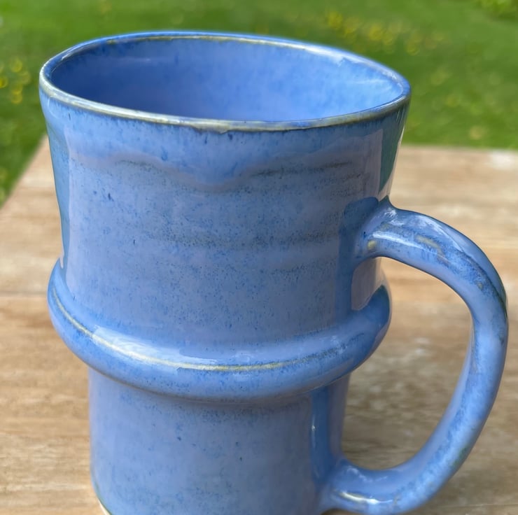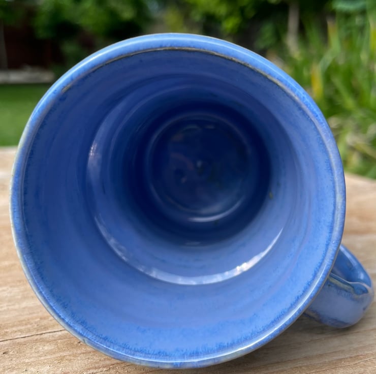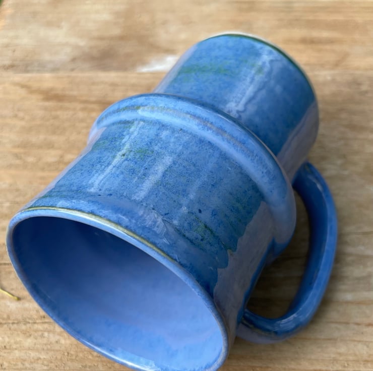 The mug was dried slowly once the handle was added, over a few weeks. It was then fired to over 1000°c in a bisque firing. It was then glazed and fired again over 1200°c.