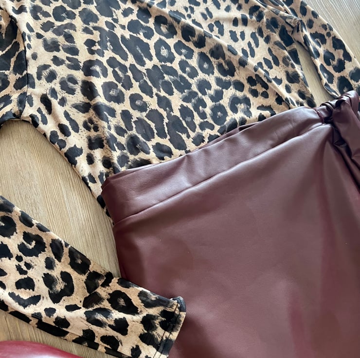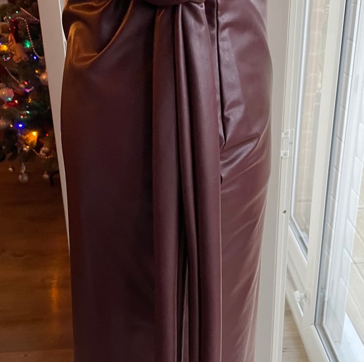 A twist on our original Alexus Vegan Leather Wrap Skirt - created in burgundy, vegan leather. with added stretch.