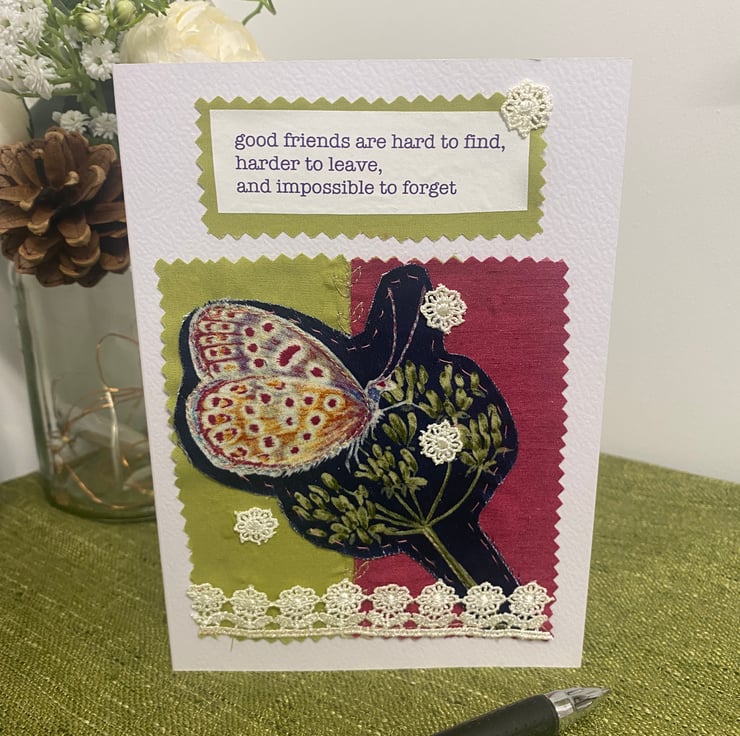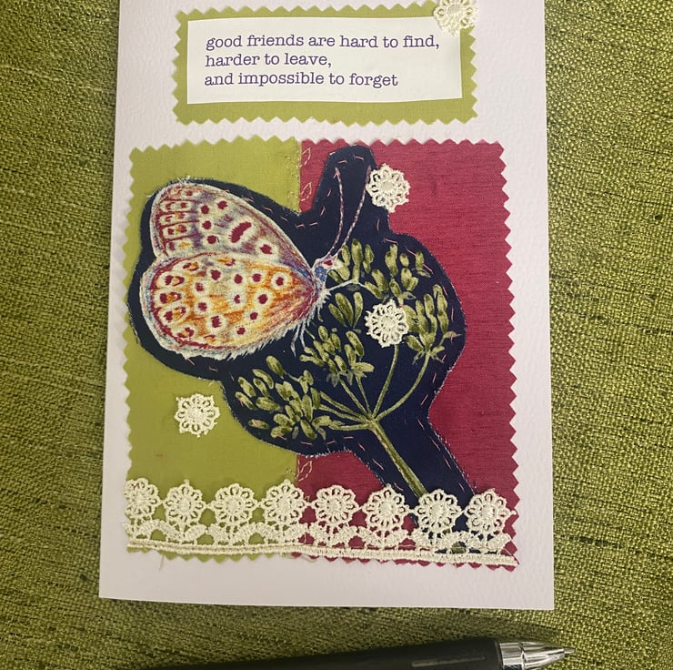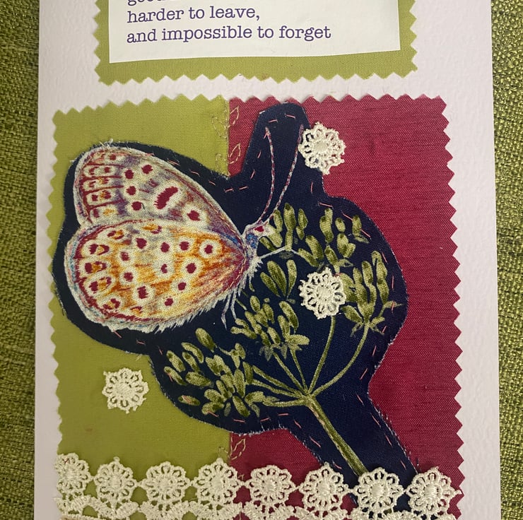 This is a one of a kind, A5 hand made card, featuring a butterfly on a hedgerow flower. Trimmed with lace and hand stitched detail.