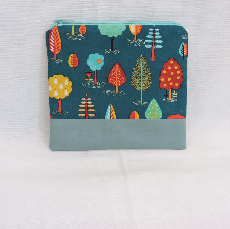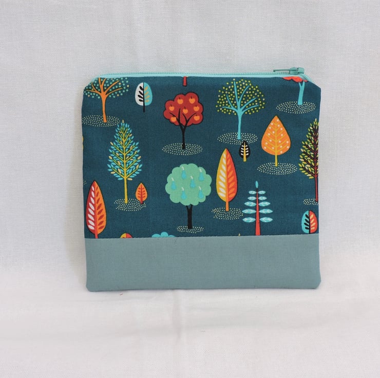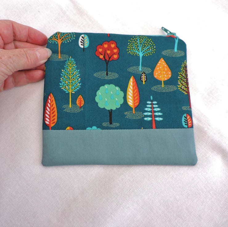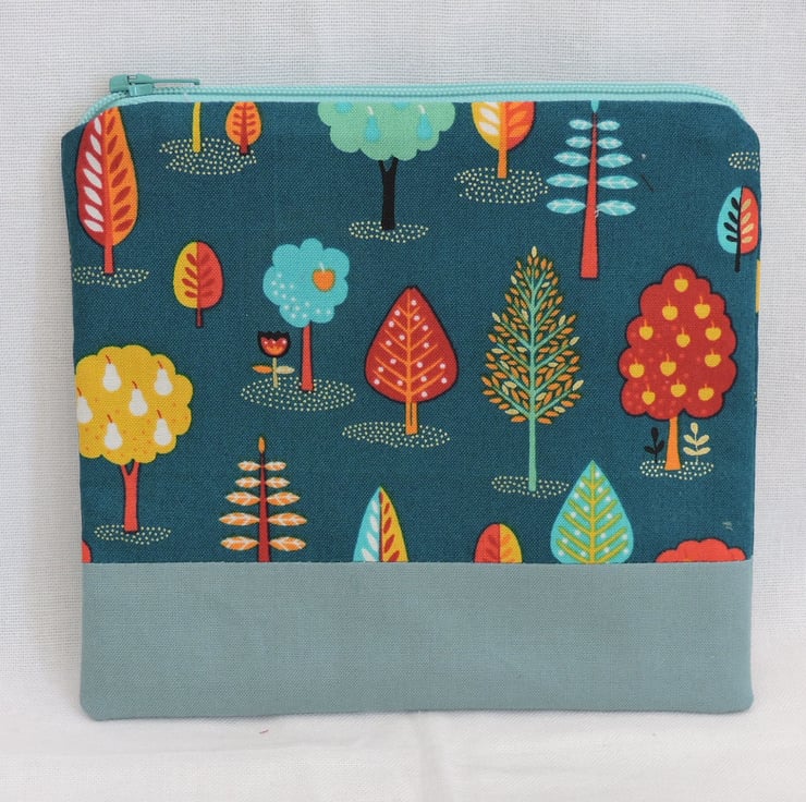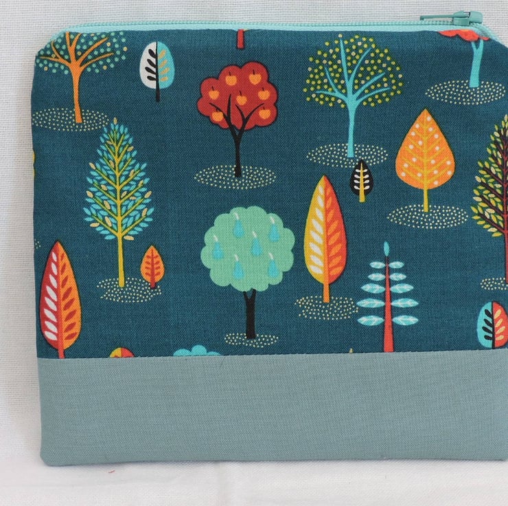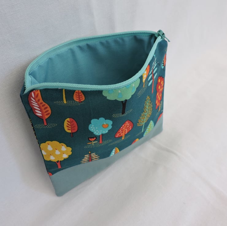Sale Patchwork make up bag, zipped pouch which has been made with two different cotton fabrics. Stylised trees in red, green, yellow, orange and turquoise on a teal background with a band of pale teal fabric at the bottom. The inner is a plain turquoise fabric. Finished with a turquoise top zip.