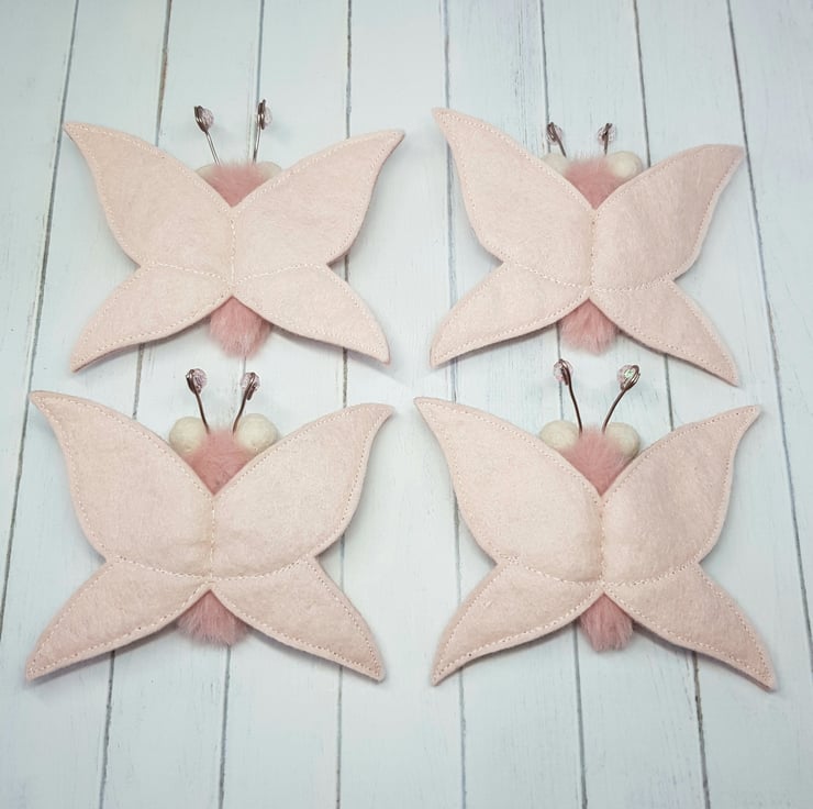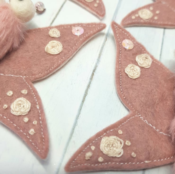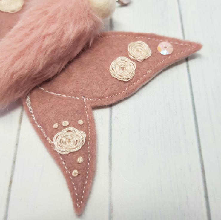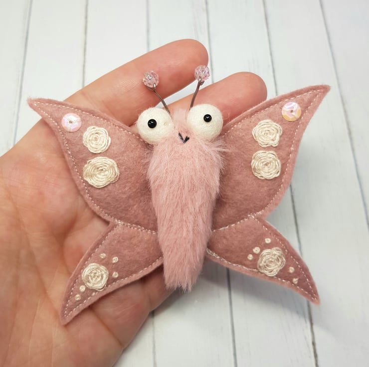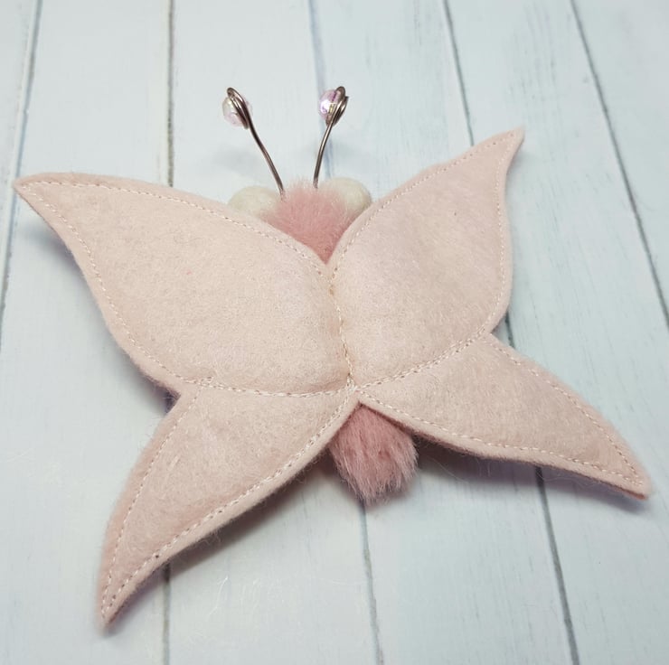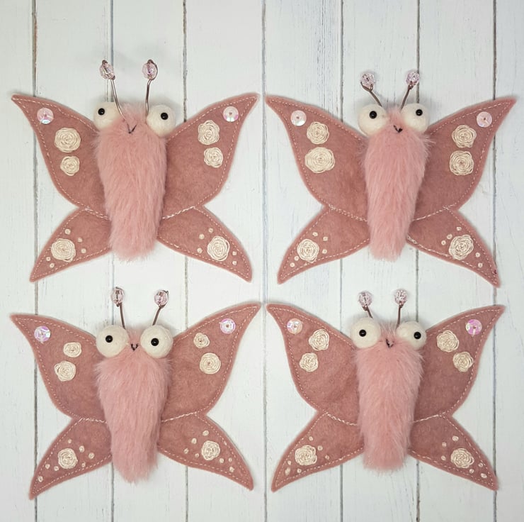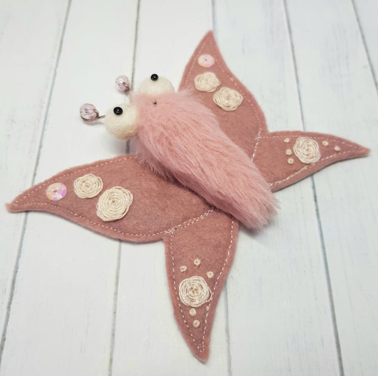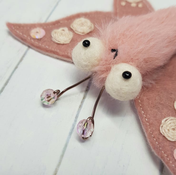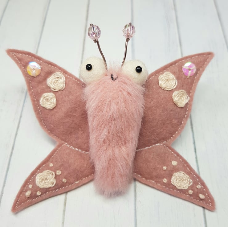 Decorative Textile butterfly with faux fur body and hand cut wings. The wings are made from felt in two shades of pink with sequins hand sewn into place and hand embroidered roses. The eyes are felted balls sewn into place with black pin pupils. The antenna are made from wire with faceted bead bent into place. Butterfly measures roughly 9cm tall with a 10cm wingspan. This is not a toy and meant for decorative purposes only. This listing is for one butterfly chosen at random from those pictured. The butterfly comes with transparent loop hanger.
