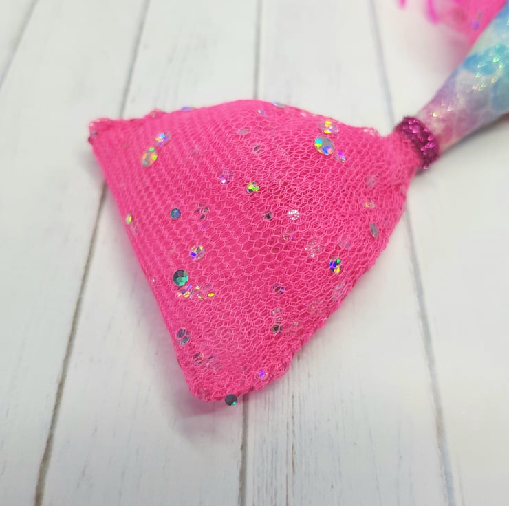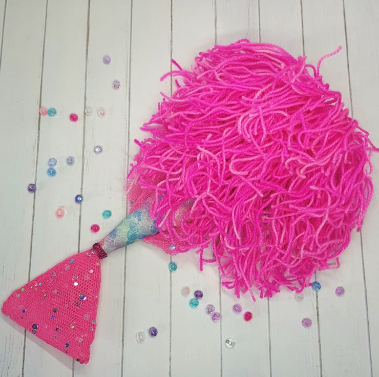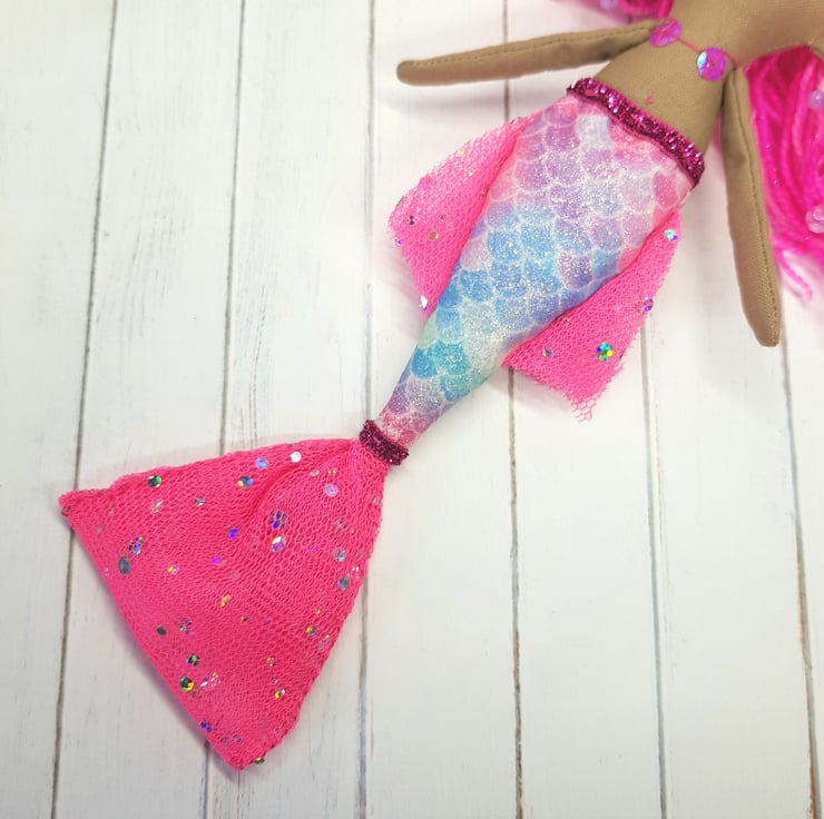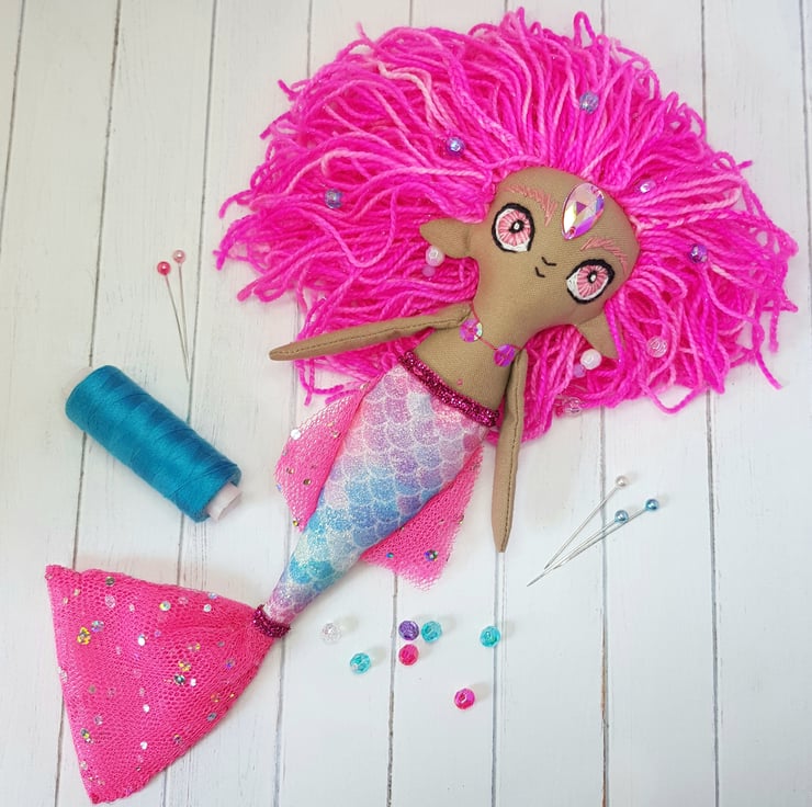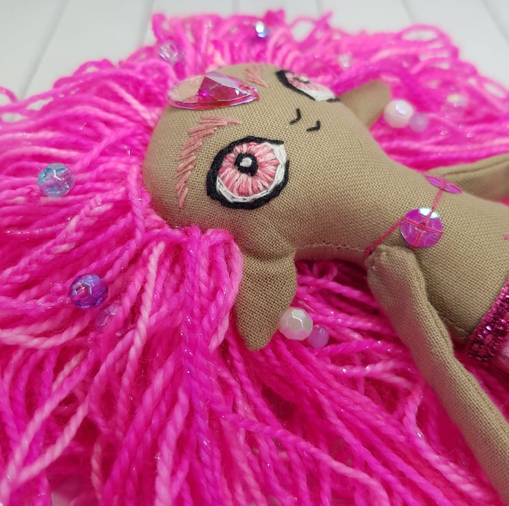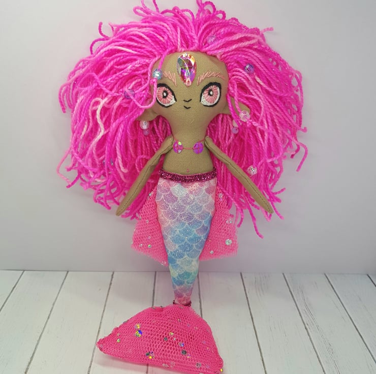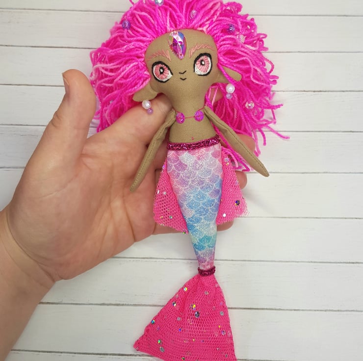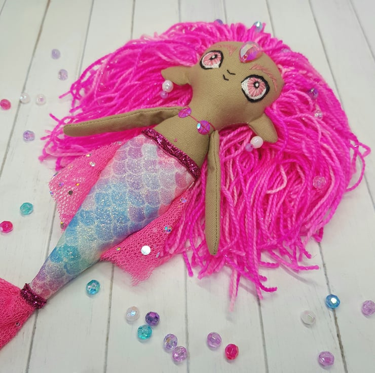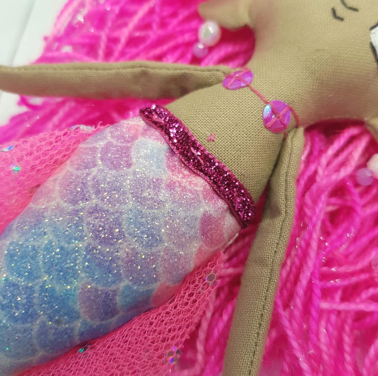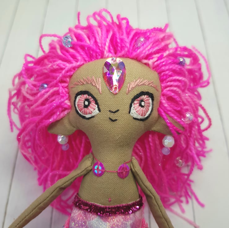 This doll has beautiful art yarn hair hand sewn into place with a hand embroidered face and faux jewel details. The bra is sequins and the tail is printed glitter with sparkle tulle tail and fins. The earings are upcycled beads and the doll measures roughly cm tall. This is for decorative purposes only and not a toy. Can have a transparent loop hanger attached if desired, just add a note to let me know.