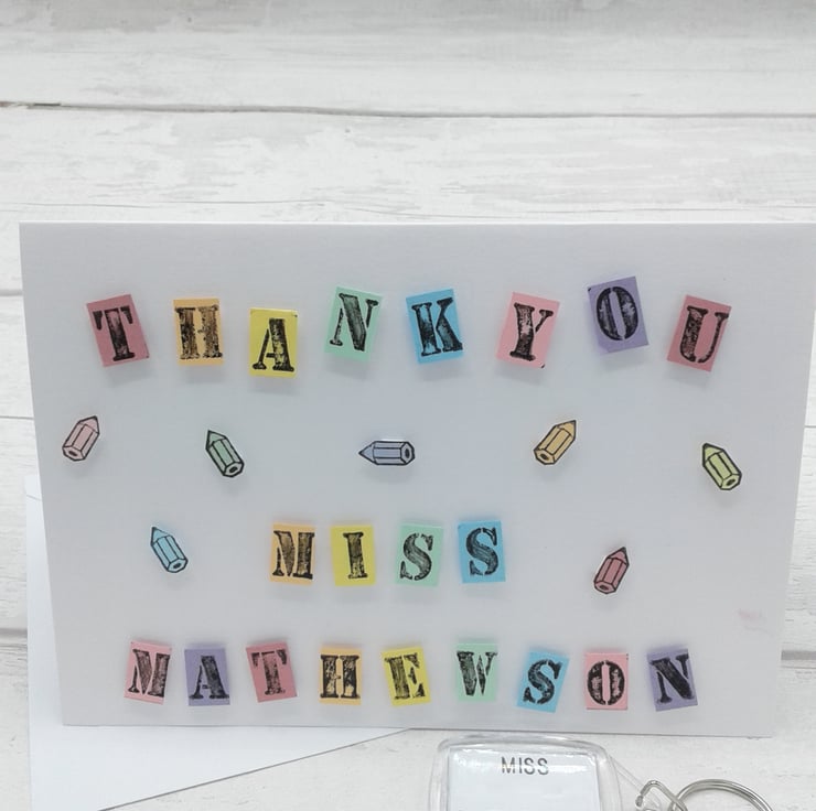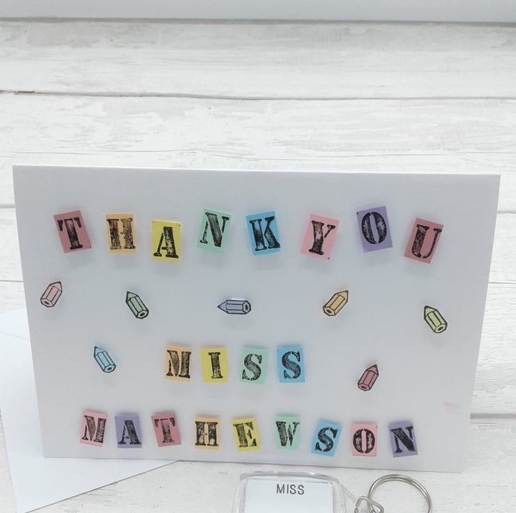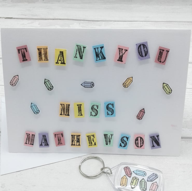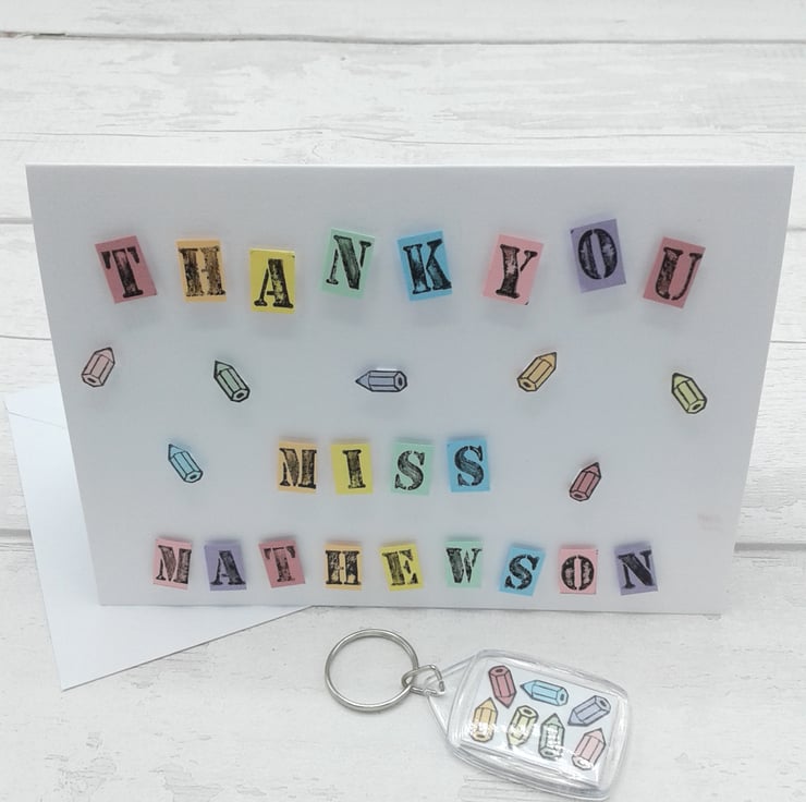 This set comprising of a personalised card, envelope and printed insert, together with a coordinating personalised key ring, is a lovely way to show your appreciation to teachers, teaching assistants and nursery staff.