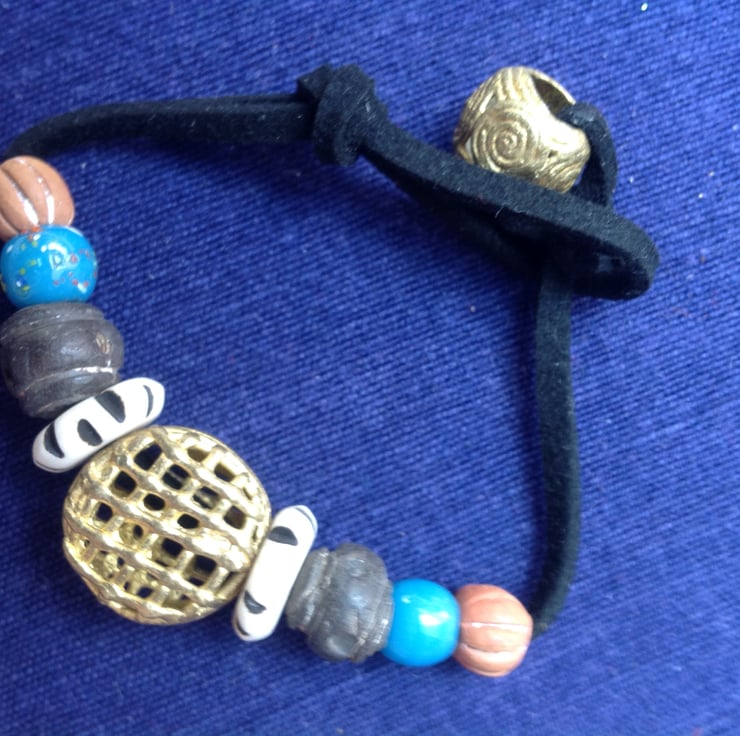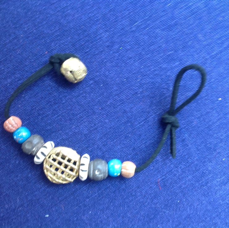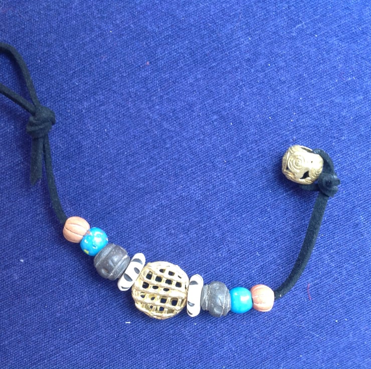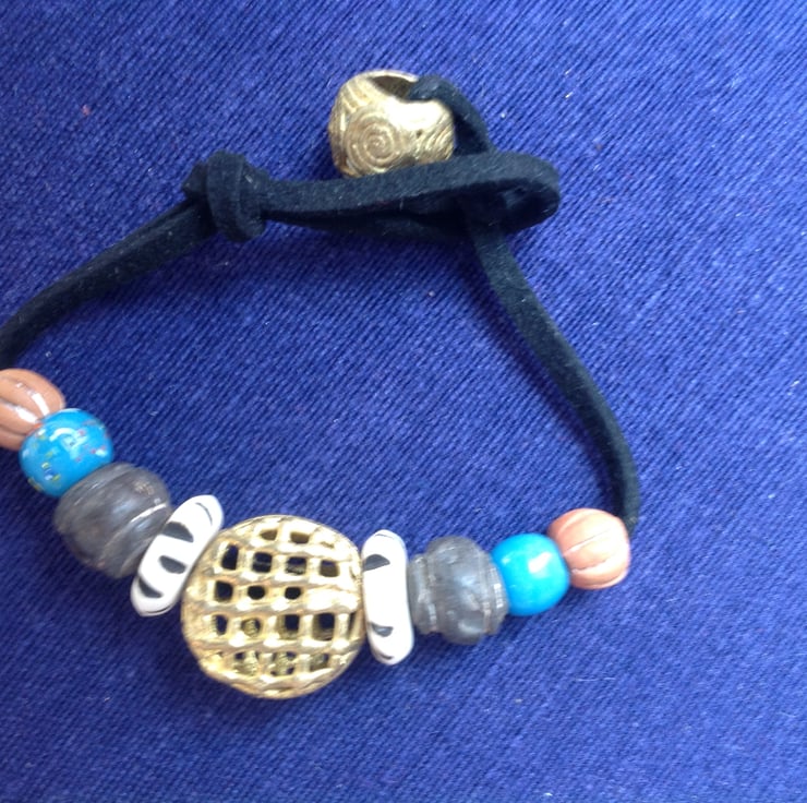 This one-off cord bracelet is made with a central handmade bead of recycled brass from Ghana. There are a pair of vintage Tibetan prayer beads, some Himalayan 'end of day' beads and clay beads from Mali. They have been threaded onto faux suede, which is stronger than real suede and vegan-friendly! Another handmade African brass bead has been used for the fastening and you can move the knot on the loop along to adjust the fit.