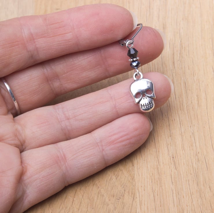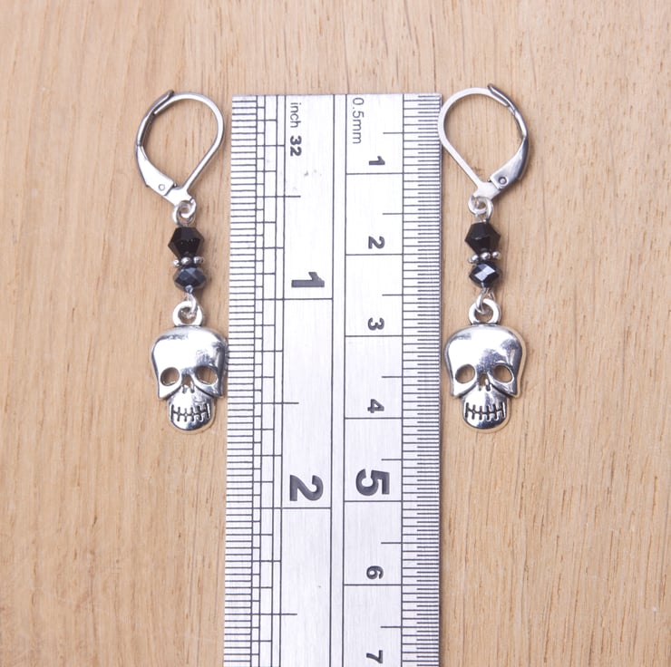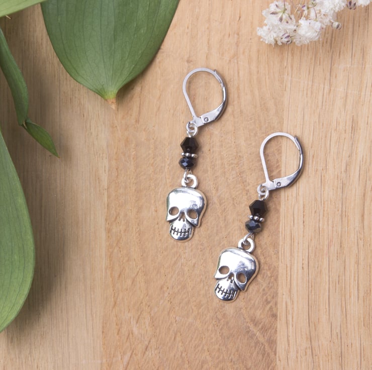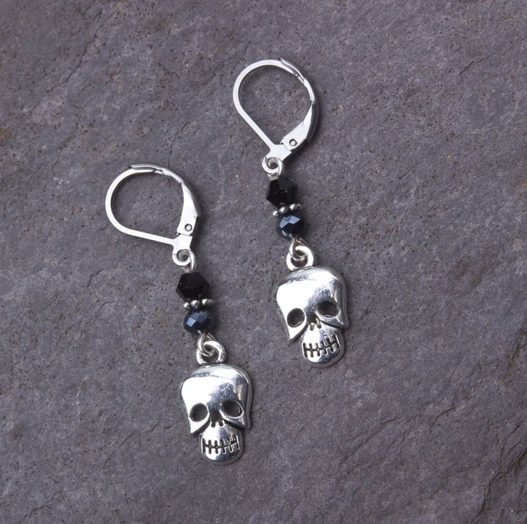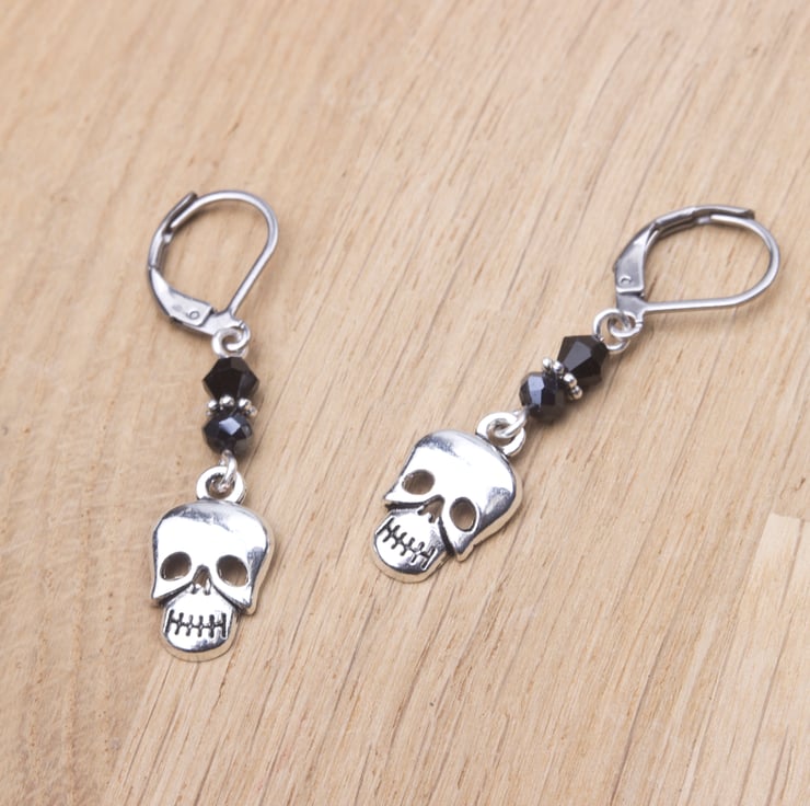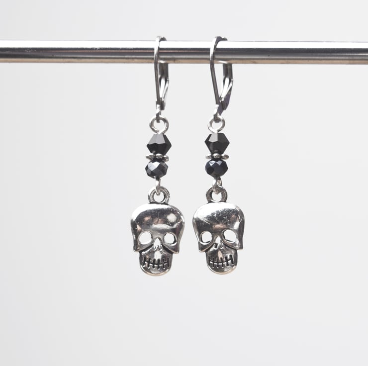 These earrings feature Tibetan silver skull charms. The beads they dangle from are faceted glass in shades of grey and black. The earrings are about 4cm long, including the lever back ear fittings made of stainless steel. These earrings are ready to ship.