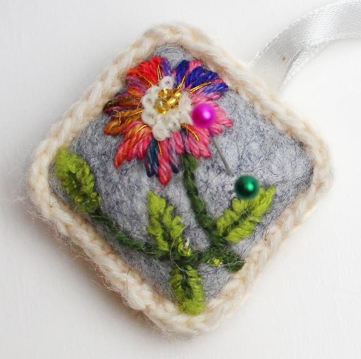 The front of the square pad is made using grey felt which has been hand embroidered with a pink dog rose and the back is my own Campion print. This has then had a cream crochet trim added around it. The pad is attached with white ribbon to the scissor handle. It will be easy to identify your scissors and find them easily with this scissor keeper. You can also use the pad for pins and needles to use as you work. The size of the pad is 4cms(1.5 inches) squared without the trim. The gold coloured fish scissors are also included in the purchase.