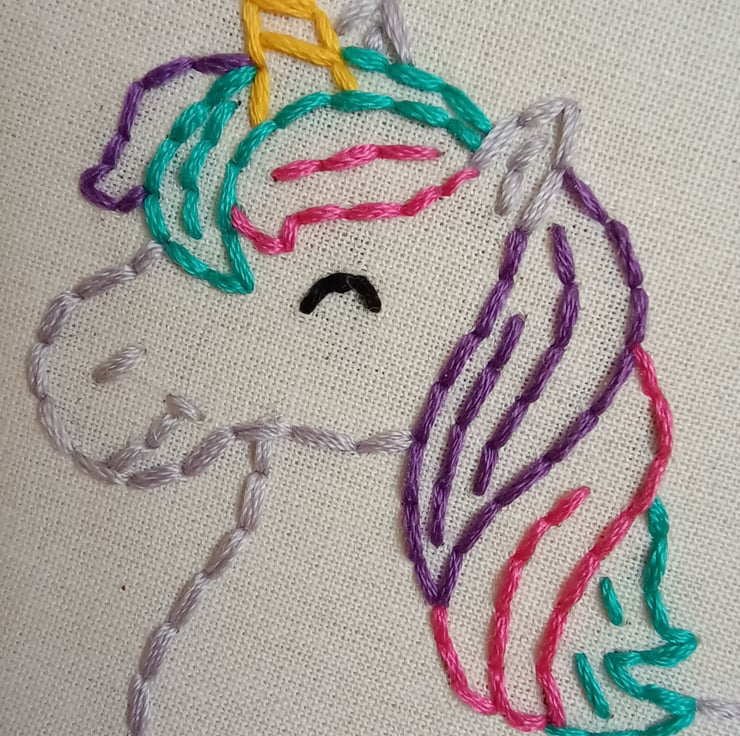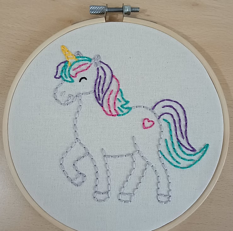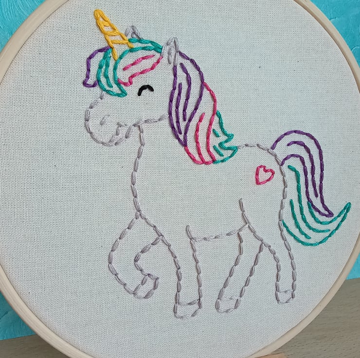 This unicorn embroidery hoop has been designed with hand sewing beginners in mind. It uses only one type of stitch (back stitch) to create the wonderful friendly character pictured. The unicorn is sewn using stranded embroidery thread within the hoop that then forms its frame. Step by step instructions complete with photographic images are included to make this project as user friendly as possible. One of the great things about this embroidery project is that it can be easily picked up and put down as a mindful activity without you loosing your place or the stitches unravelling. It makes a wonderful gift to those with creative personalities who would like to try their hand at a new skill.