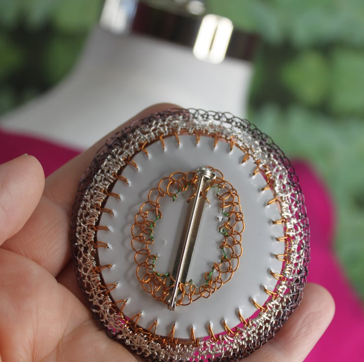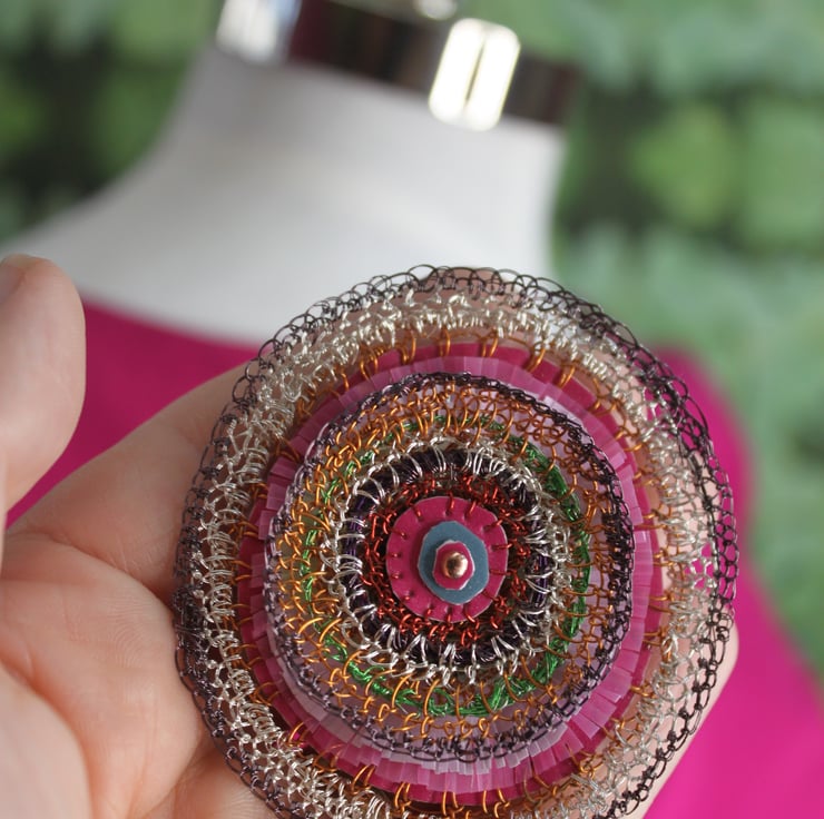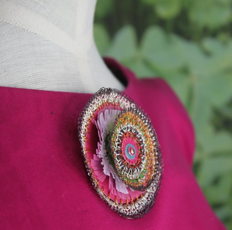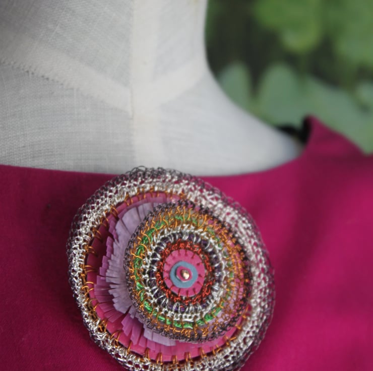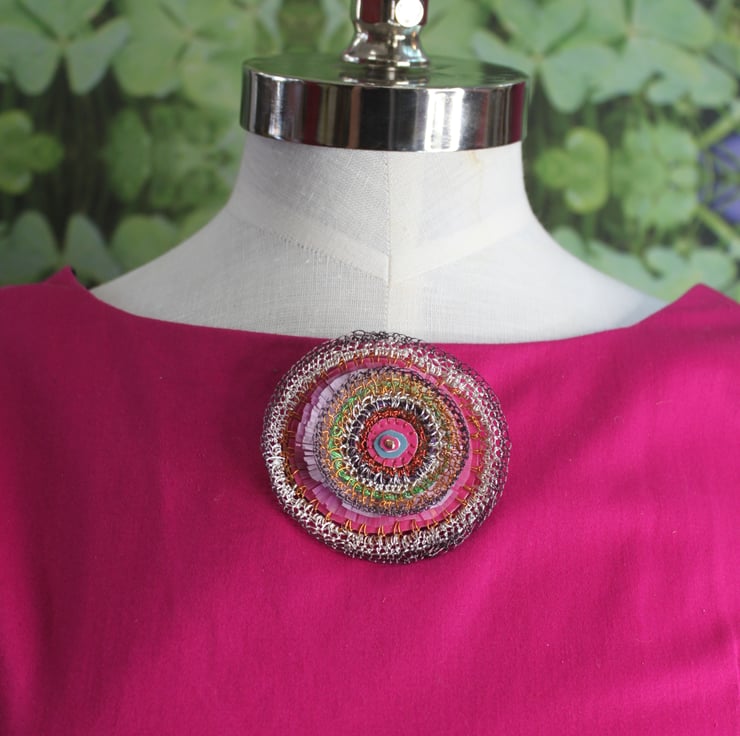 - layers of vinyl banners, plastic divider sheets, television wire and bought wire, in tones of pinks, copper and silver. Intricately cut frills and stitched circles make up this 3d 7cm diameter circle (actually oval brooch).