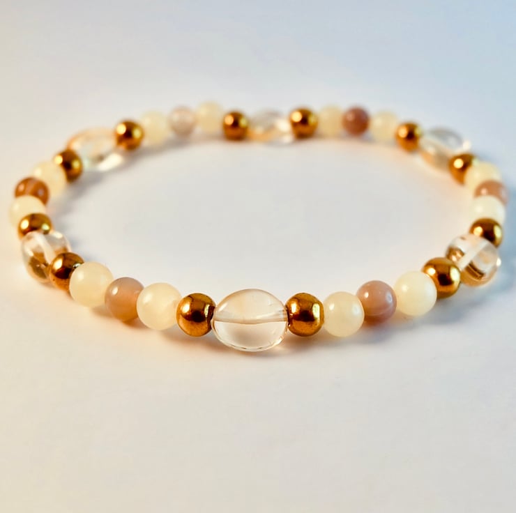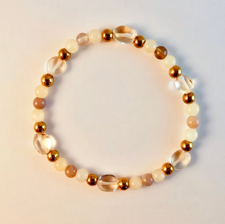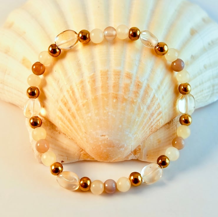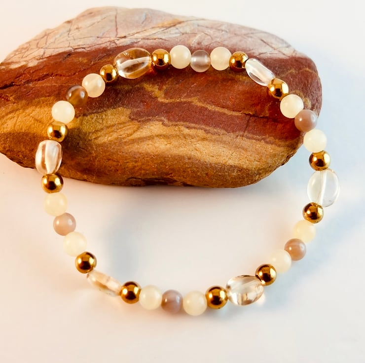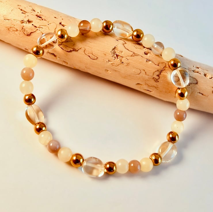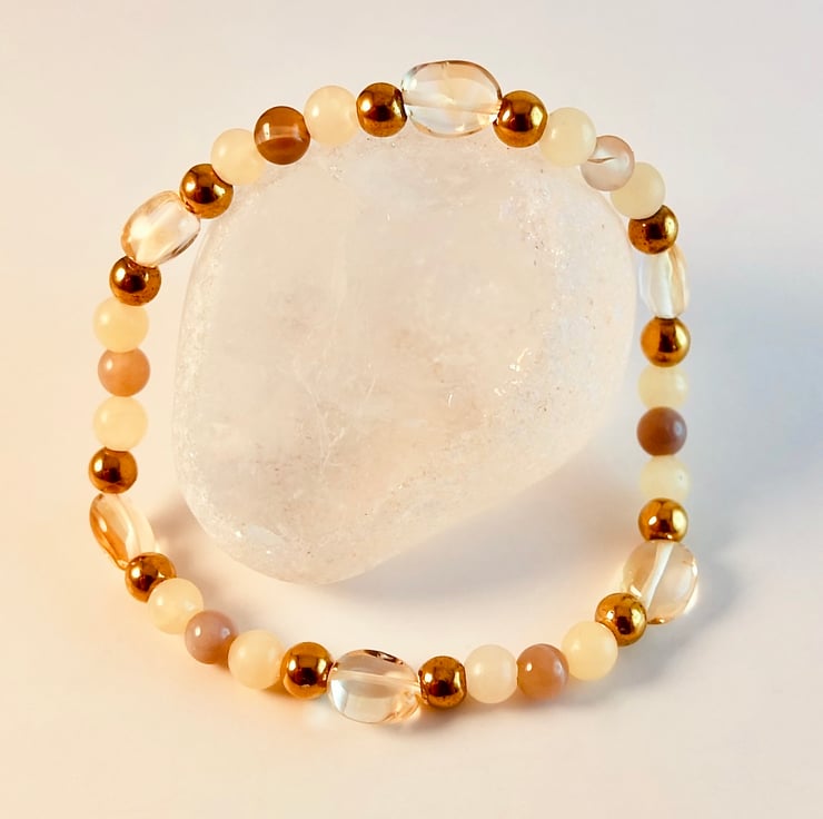 Dainty, summery bracelet featuring nuggets of translucent, pale lemon, natural Citrine, set between 4mm beads of grey-brown Agate and Ambronite, and highlighted with 4mm golden Hematite.